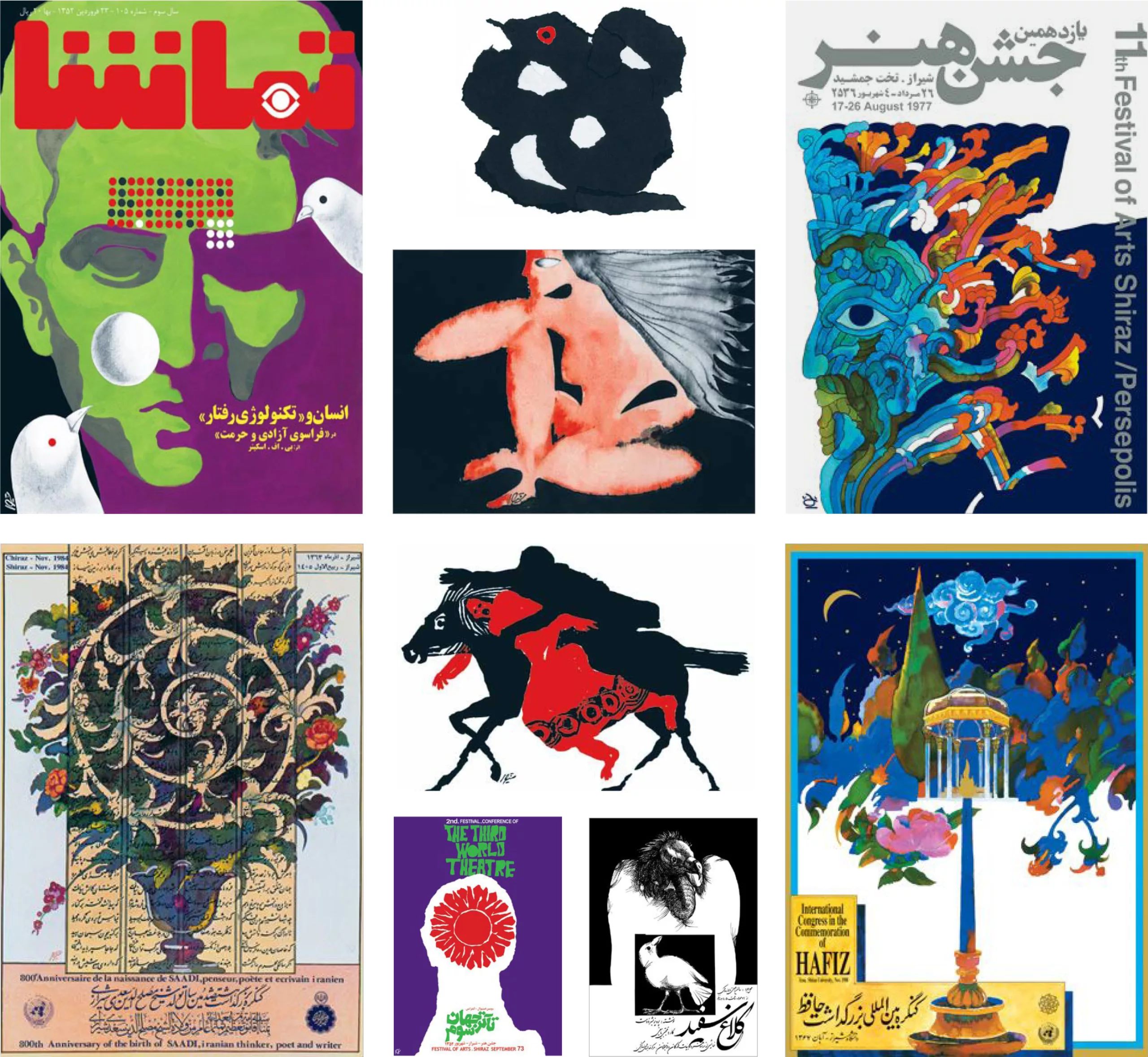 Formés à l’occidentale dans une culture extrêmement riche, ils refusent de céder au chantage de commandes purement mercantiles et publicitaires, et créent leur propre grammaire visuelle. Et ce en dépit du fait que la majorité des clients du privé se suffisent de plagiats des styles européen ou américain. Curieux, informés, inspirés aussi par les grands courants graphiques de l’Ouest, en recherche technique et créative, leur pratique est centrée sur l’analyse et la présentation de solutions visuelles à un problème de communication. De nombreux magasines ou institutions culturelles progressistes -comme Kanoon qui organisait des festivals pour faire la promotion de livres d’enfants et de films d’animation- leurs permettent de créer librement des supports visuels créatifs, et financés par le régime du Shah.