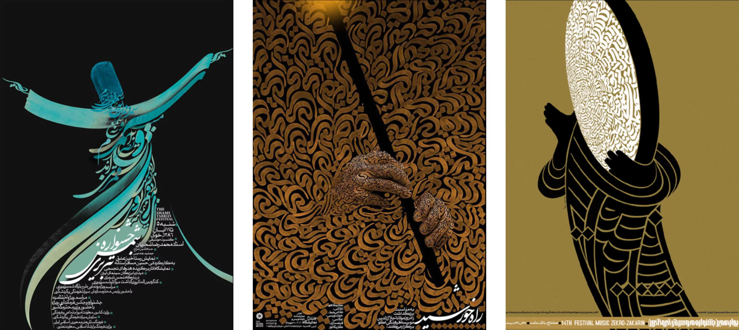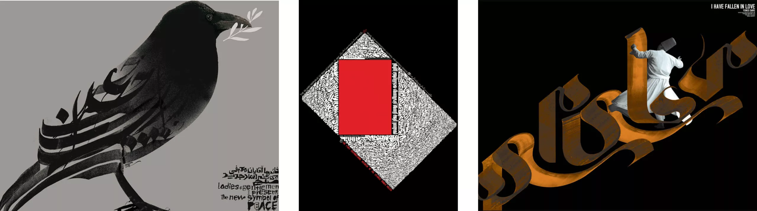 Dans la lignée de ces traditions, le texte est très souvent stylisé encore aujourd’hui, et s’inscrit pleinement dans la composition graphique. Il y est un élément majeur, voire supplantant le visuel (alors que c’est majoritairement l’inverse dans notre culture). Mots et images s’entremêlent pour ne faire qu’un, les lettres deviennent illustrations. On ne peut saisir le sens du graphisme iranien sans prendre en compte l’importance du texte pour cette culture.