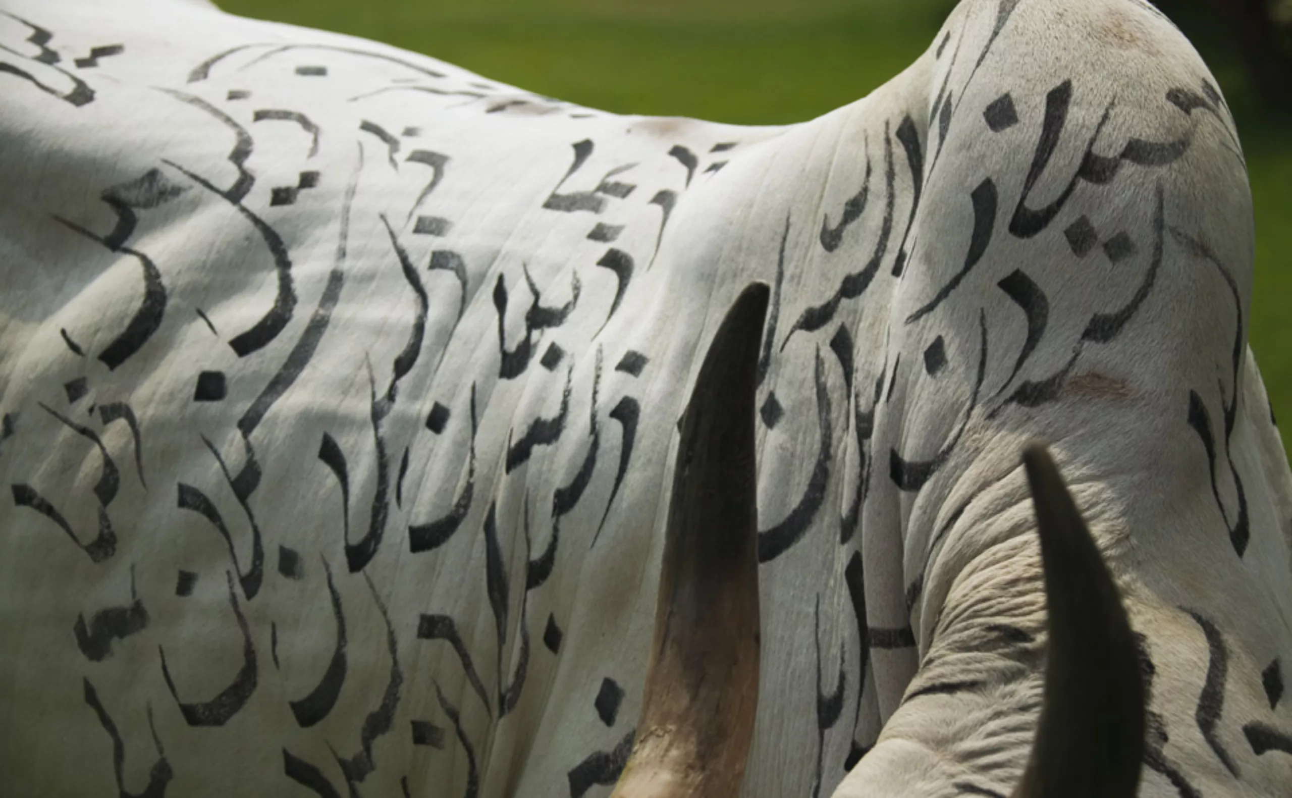 La dernière image est un travail de lettres dénuées de sens dessinées sur une vache sacrée hindoue, qui porte ces lettres harmonieusement, pour illustrer les deux grandes religions qui déchirent la société indienne.