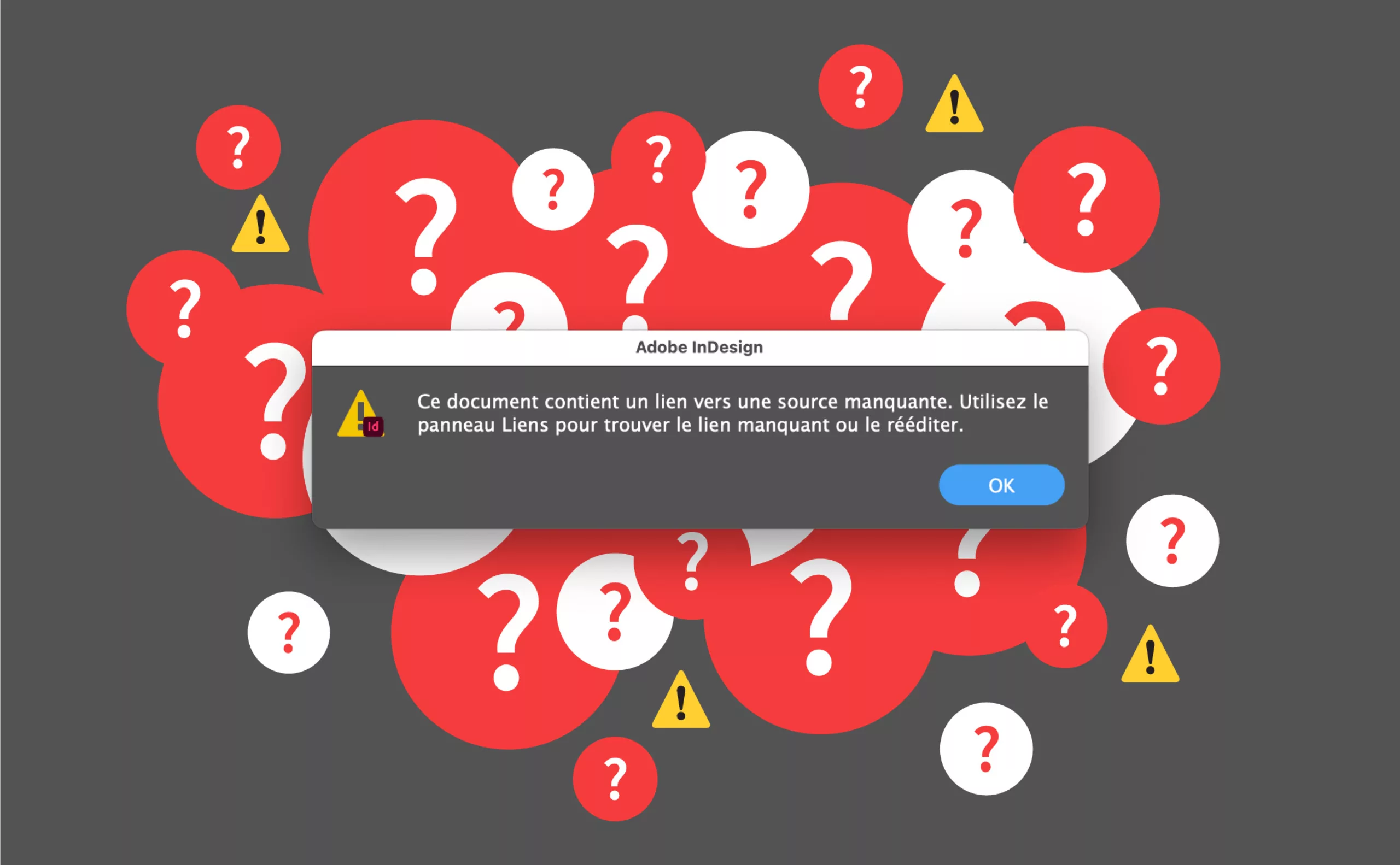 En ouvrant un fichier, Indesign (ou Illustrator) sait retrouver les fichiers manquants des liens rompus quand ils sont rangés dans le même dossier que le fichier Indesign. Mais cette situation est rare. Généralement vous rangez les images dans un sous-dossier, voire dans plusieurs dossiers éparpillés. C’est là que rééditer manuellement plusieurs centaines de liens rompus peut vite devenir un calvaire.