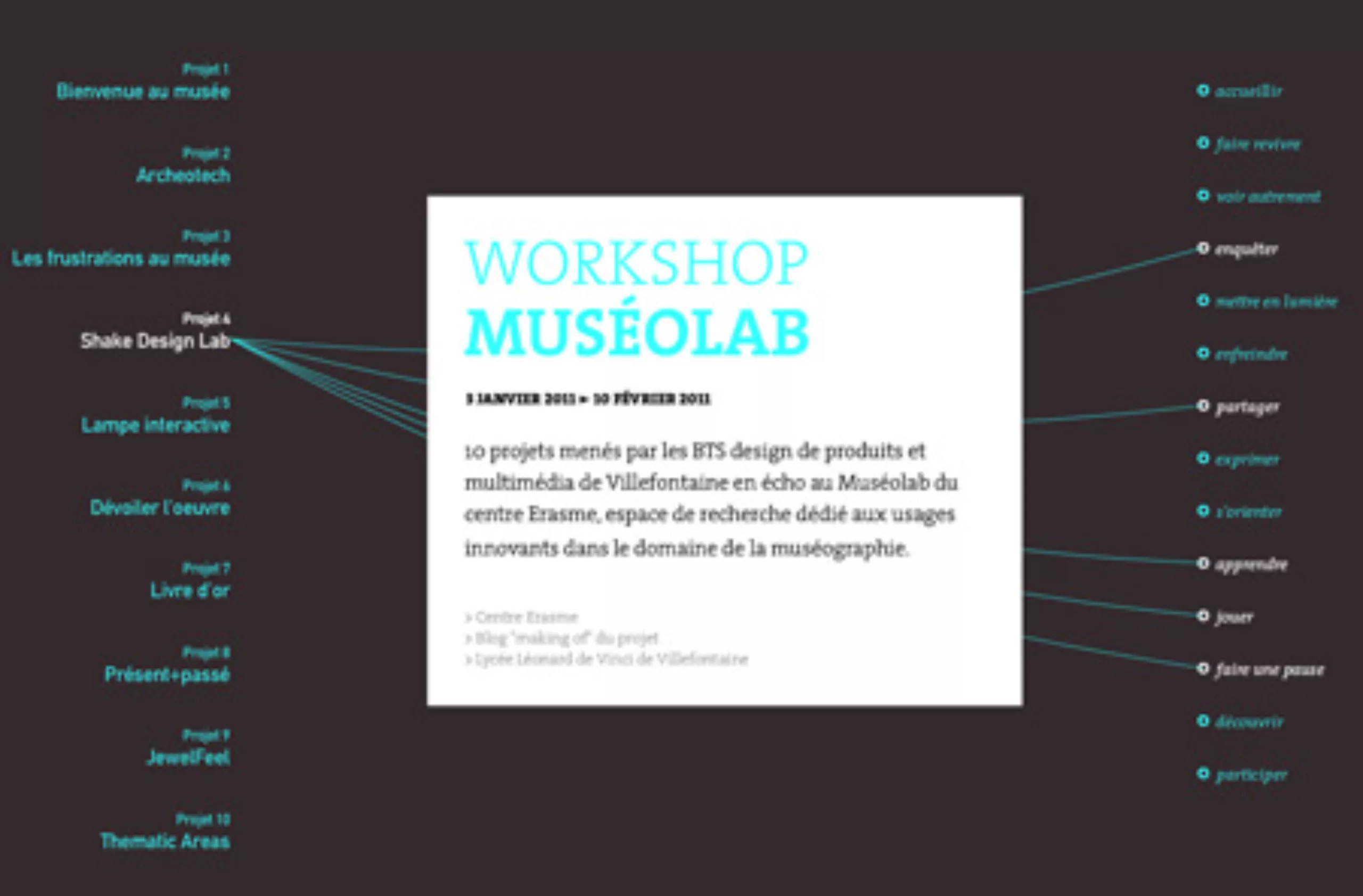 Projet Muséolab mené l’année dernière en binômes BTS design produits/ BTS multimédia avec le centre Erasme (musée et nouvelles technologies) autour des usages innovants dans le domaine de la muséographie. Découvrez les 10 projets ici > http://museolab.pixelpoivre.net/expo/