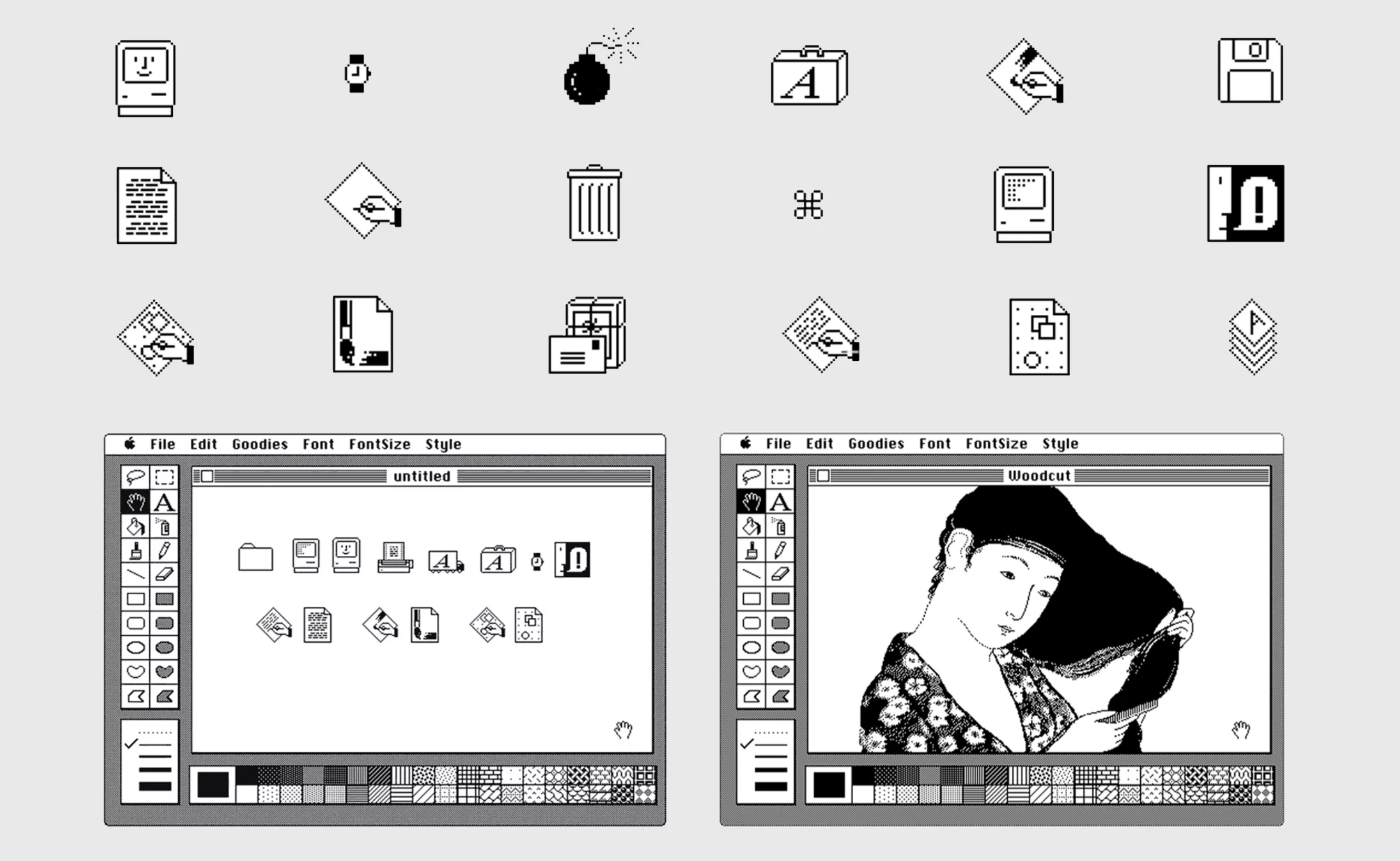 C’est la graphiste Susan Kare qui désigne dans les années 80 ces icônes que nous connaissons tous, pour Steve Jobs, sur Macintosh. Elle invente, par soucis “d’économie d’expression”, les icônes du logiciel Paint comme le pot de peinture ou le pinceau, qui seront reprises plus tard par Adobe, ainsi que le premier alphabet d’emojis : la Caïro.
