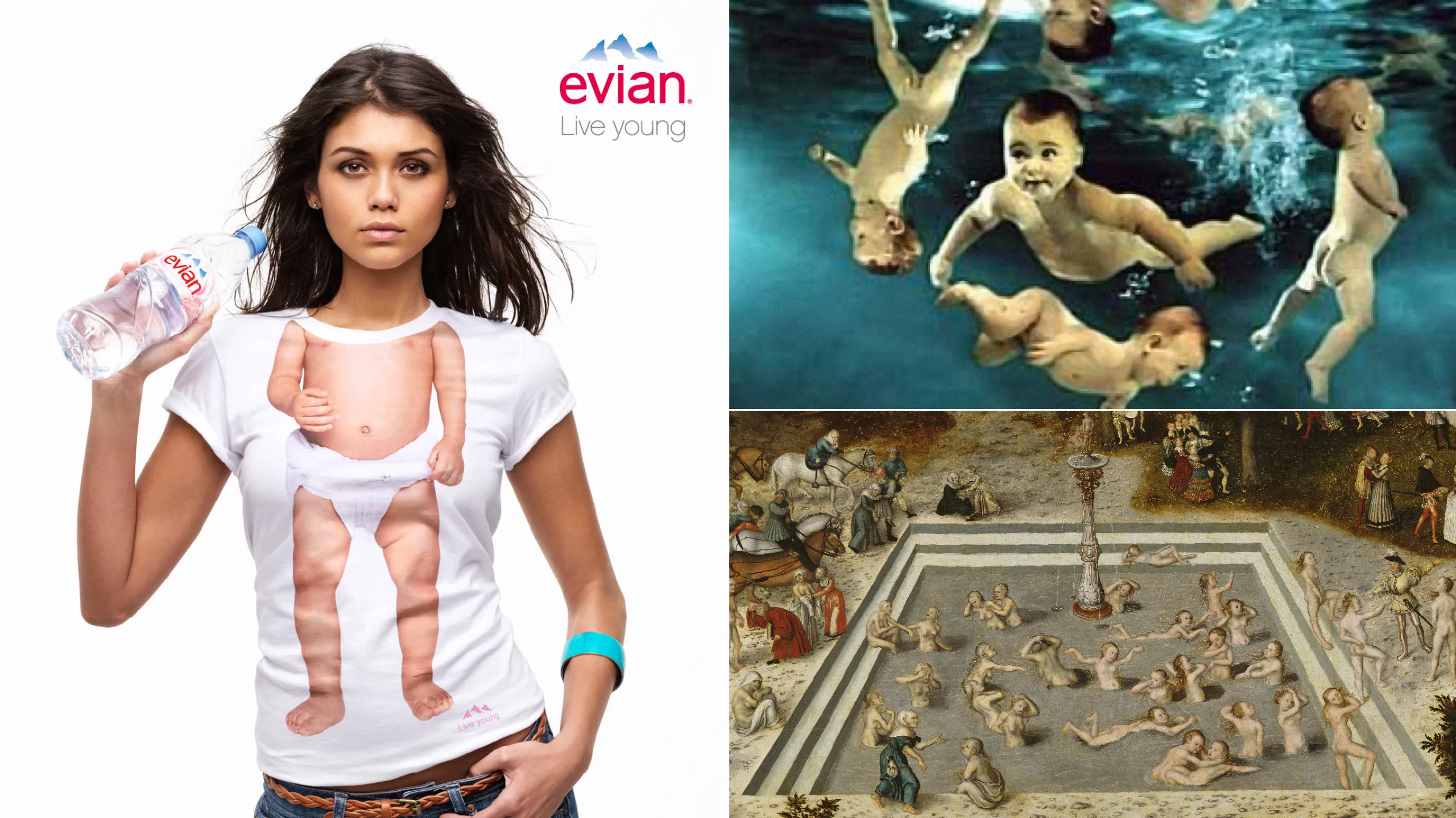 Là où d’autres eaux promettent juste d’améliorer votre transit, ou tout simplement d’étancher votre soif, evian se démarque de ses concurrents en jouant dans sa communication avec l’image du bébé et de l’enfance en insinuant que leur eau provient ni plus ni moins que la mythique source de Jouvence ! Ce positionnement est d’autant plus revendiqué et décliné depuis 1998 avec le succès planétaire du spot publicitaire créé par l’agence BETC Euro RSCG où 70 bébés exécutaient un ballet aquatique au son de la musique « Bye Bye baby » de Bay City Rollers dans une mise en scène inspirée des chorégraphies hollywoodiennes. La figure du bébé et de la retombée en enfance est depuis centrale dans l’image de la marque avec le slogan « Live Young ».