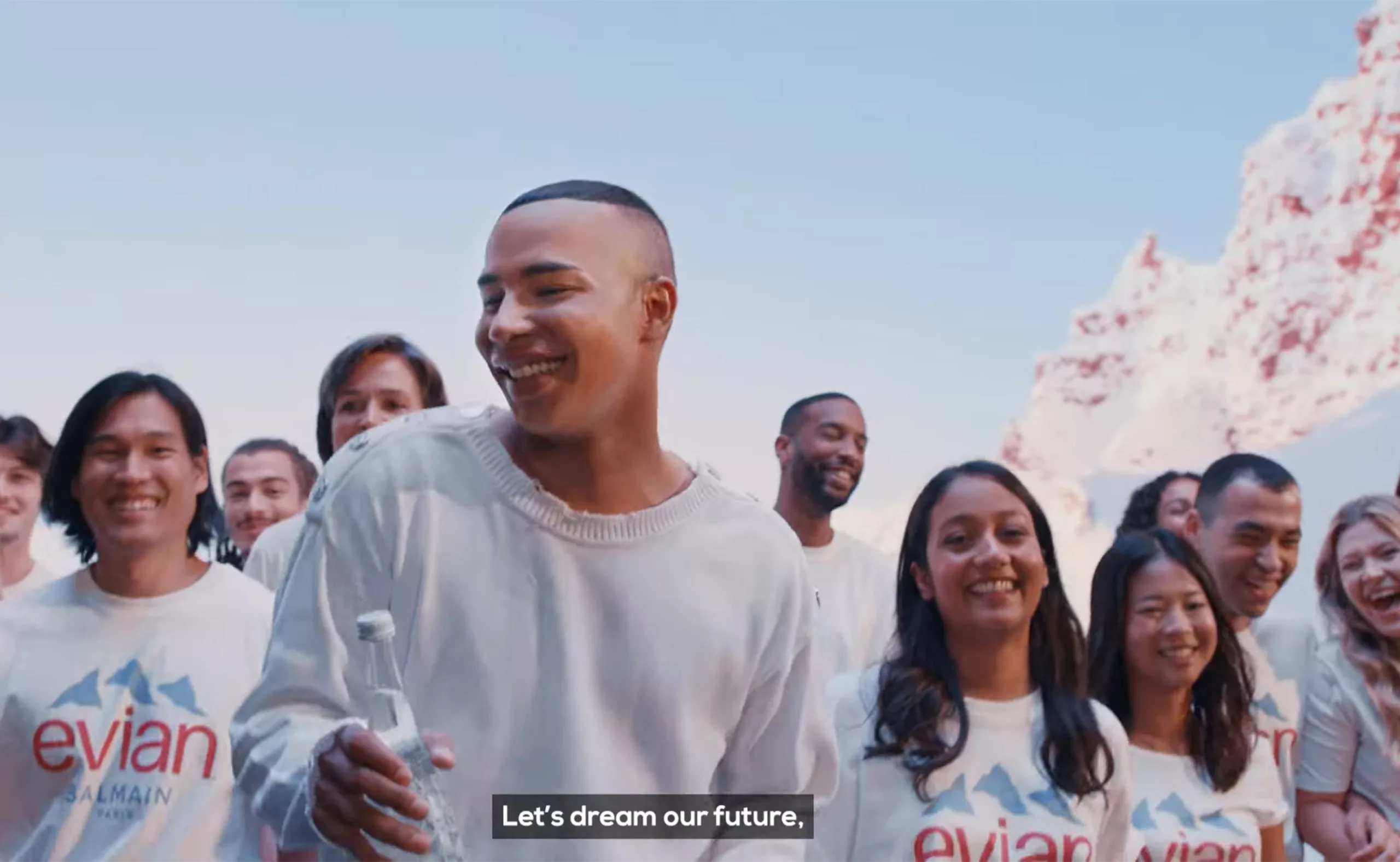 L’eau evian et la marque de couture Balmain ont lancé en avril dernier une collaboration pour “imaginer ensemble des innovations durables pour les générations futures” incarnée par une campagne commune Evian x Balmain. Elles présentent une bouteille d’eau gravée en édition limitée portée par Olivier Rousteing (DA de Balmain) et des danseurs dans des vêtements aux dégradés pastel. “Nous sommes ravis de lancer cette première collection de prêt-à-porter evian x Balmain, que tous les fans d’evian et de Balmain du monde entier pourront acheter en ligne et en boutique” note Dawid Borowiec, directeur mondial d’evian. Il faudra compter 590€ le t-shirt en coton bio et polyester recyclé, 250€ pour le bob et 2 890€ pour la veste.