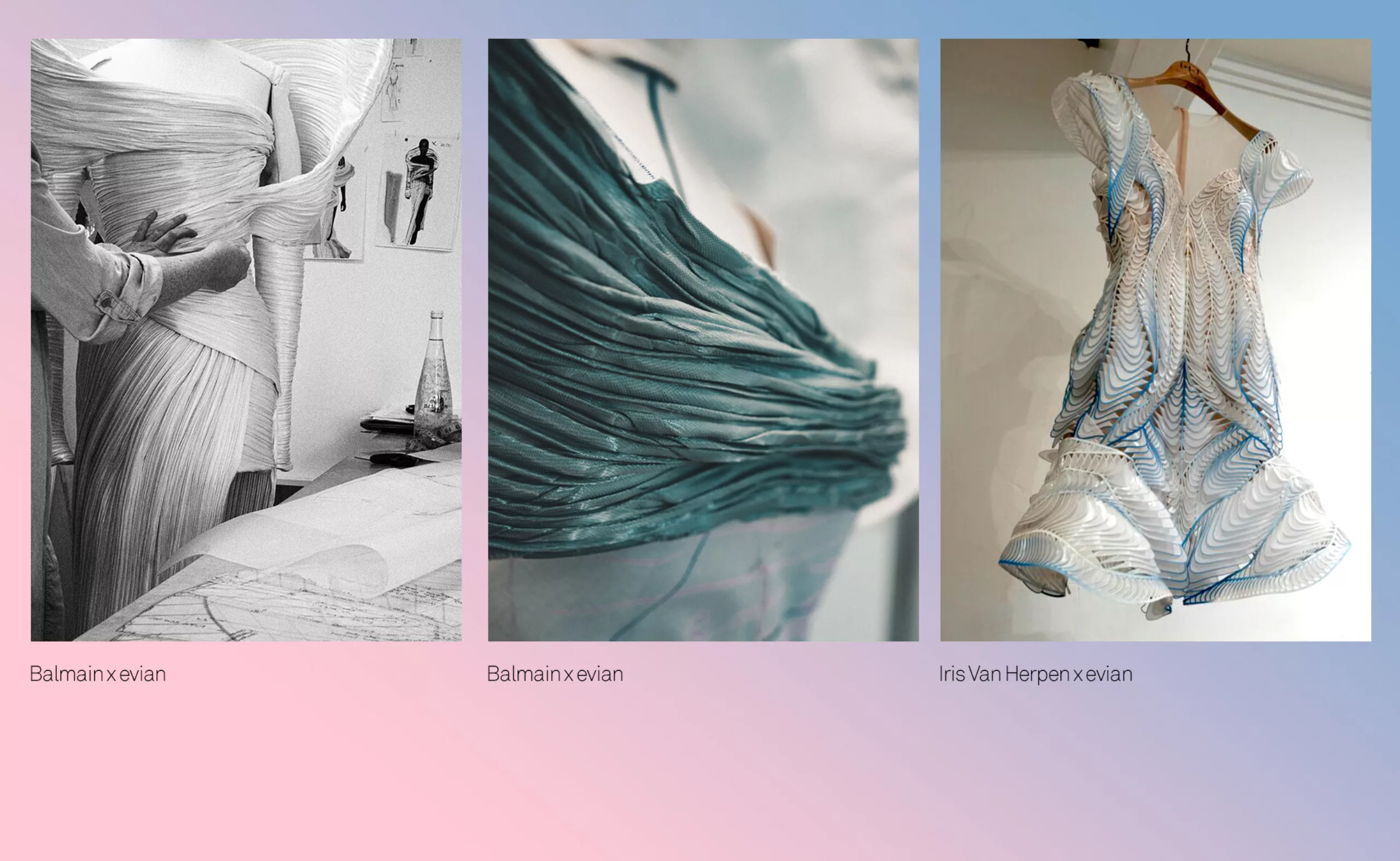 Les collaborations entre marques ne sont pas nouvelles et evian avait déjà travaillé avec Virgil Abloh, Elie Saab, KENZO, Alexander Wang, Christian Lacroix, Chiara Ferragni, Iseey Miyake ou Iris Van Herpen pour la création de bouteilles evian collector au design unique ou de robes en PET recyclé. Cette dernière collaboration devrait permettre à evian et Balmain de mettre en avant leurs engagements futurs en matière d’écologie, avec notamment pour la première entreprise le développement d’une technologie permettant la création de bouteilles en plastique 100% recyclé d’ici 2025, et pour la seconde de “proposer une approche plus durable de la mode” avec une collection capsule evian x Balmain en coton biologique, polyester recyclé et emballages en cartons issus de forêts durablement gérées en édition limitée, ainsi qu’une robe haute-couture unique en fil PET issu de bouteilles d’evian recyclées, preuve que l’on peut faire du beau avec des déchets.