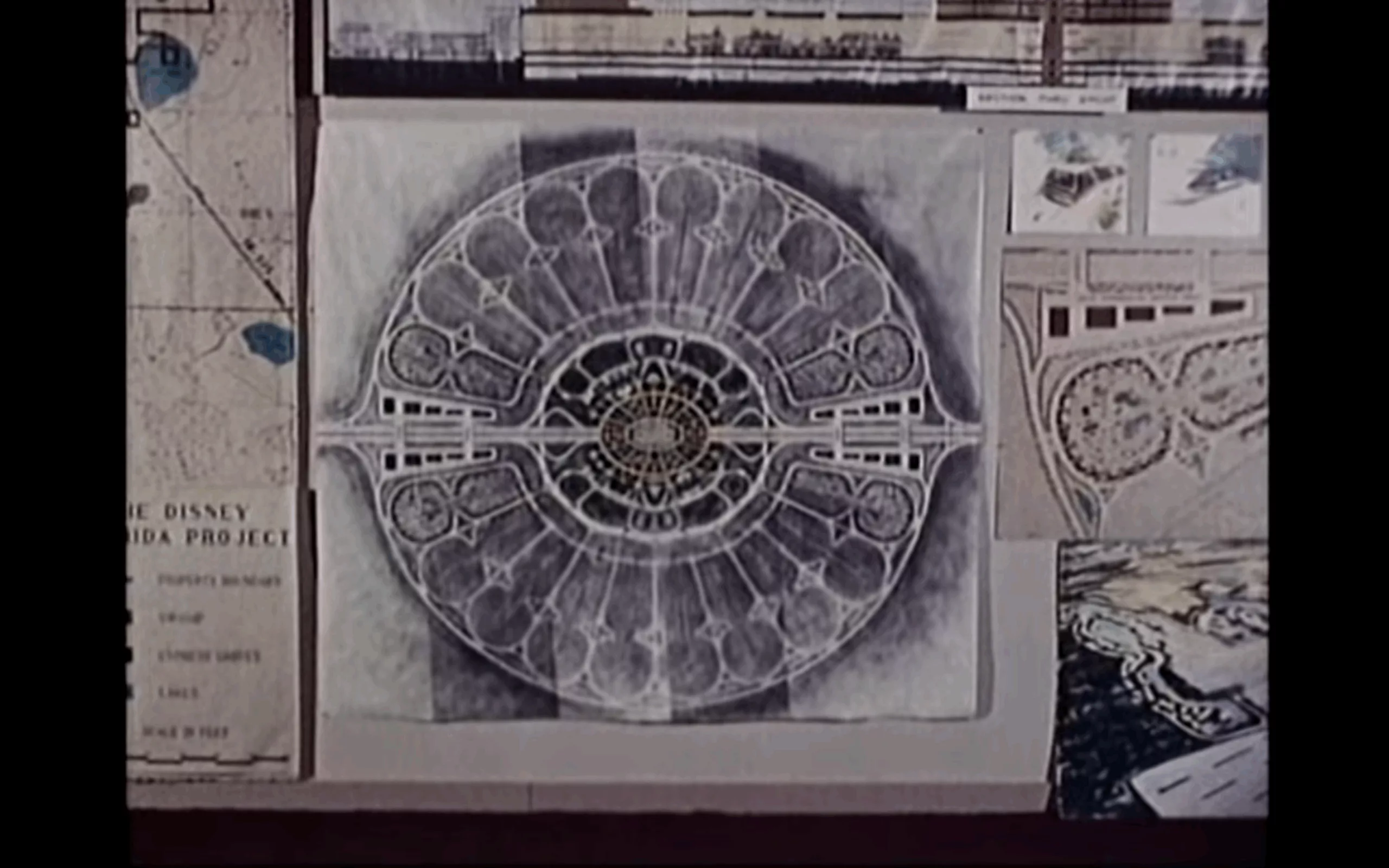 Le résultat futuriste fait penser aux plans de cités utopistes, et notamment à EPCOT, la cité idéale imaginée par Walt Disney. Ce projet abandonné à sa mort et inspiré de l’idéal de vie américain combinait travail, vie et divertissement. On en voit plus dans ce film, à partir de la 10 ème minute.