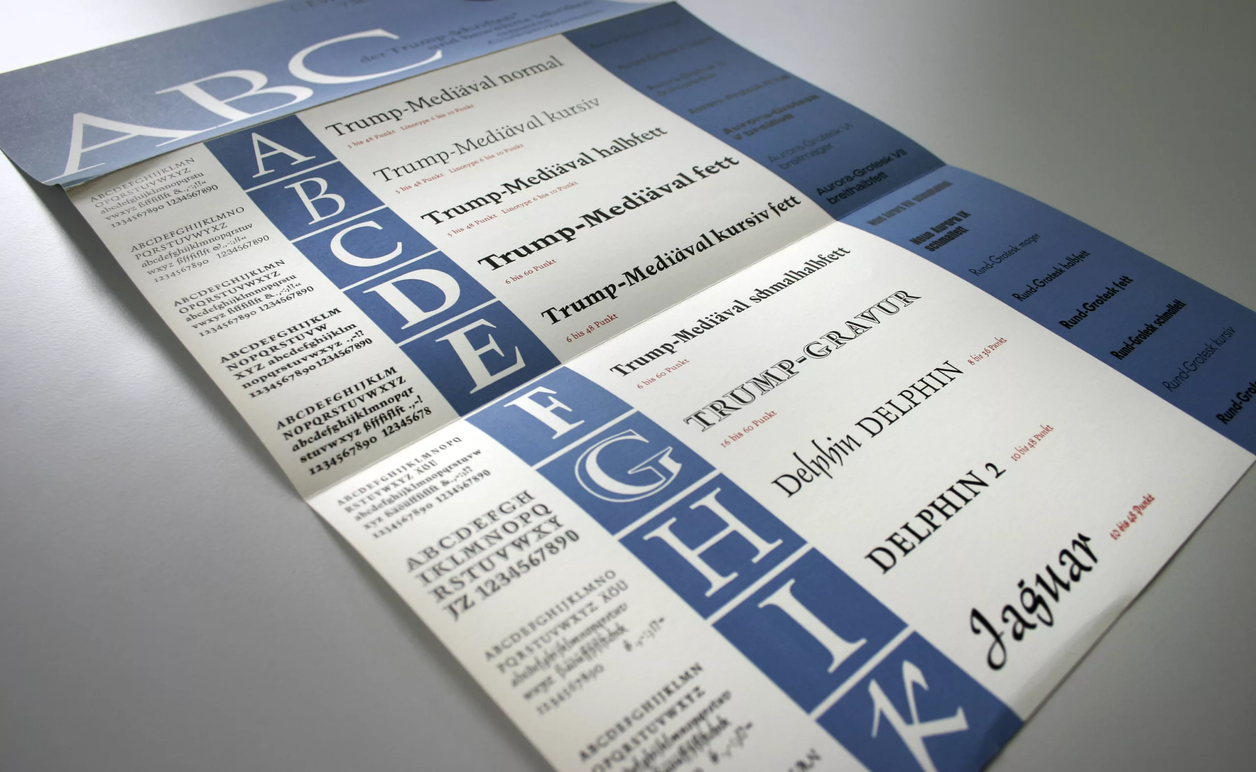Trump travaille de longues années en étroite collaboration avec Görwitz de la fonderie Weber, dont il est le typographe presque exclusif. C’est là qu’il crée toutes ses typographies, dont la City, Shadow ou Delphin.
