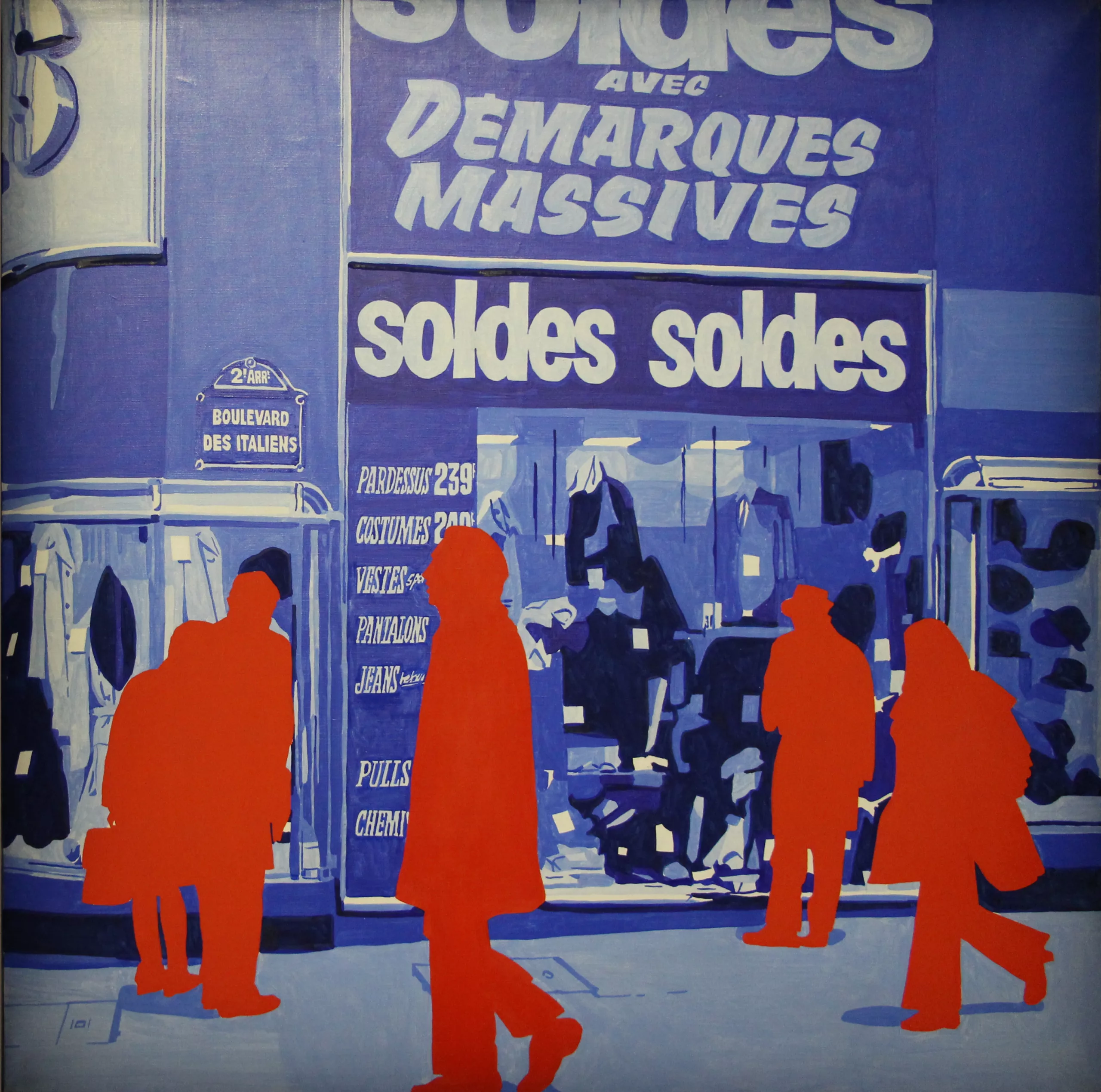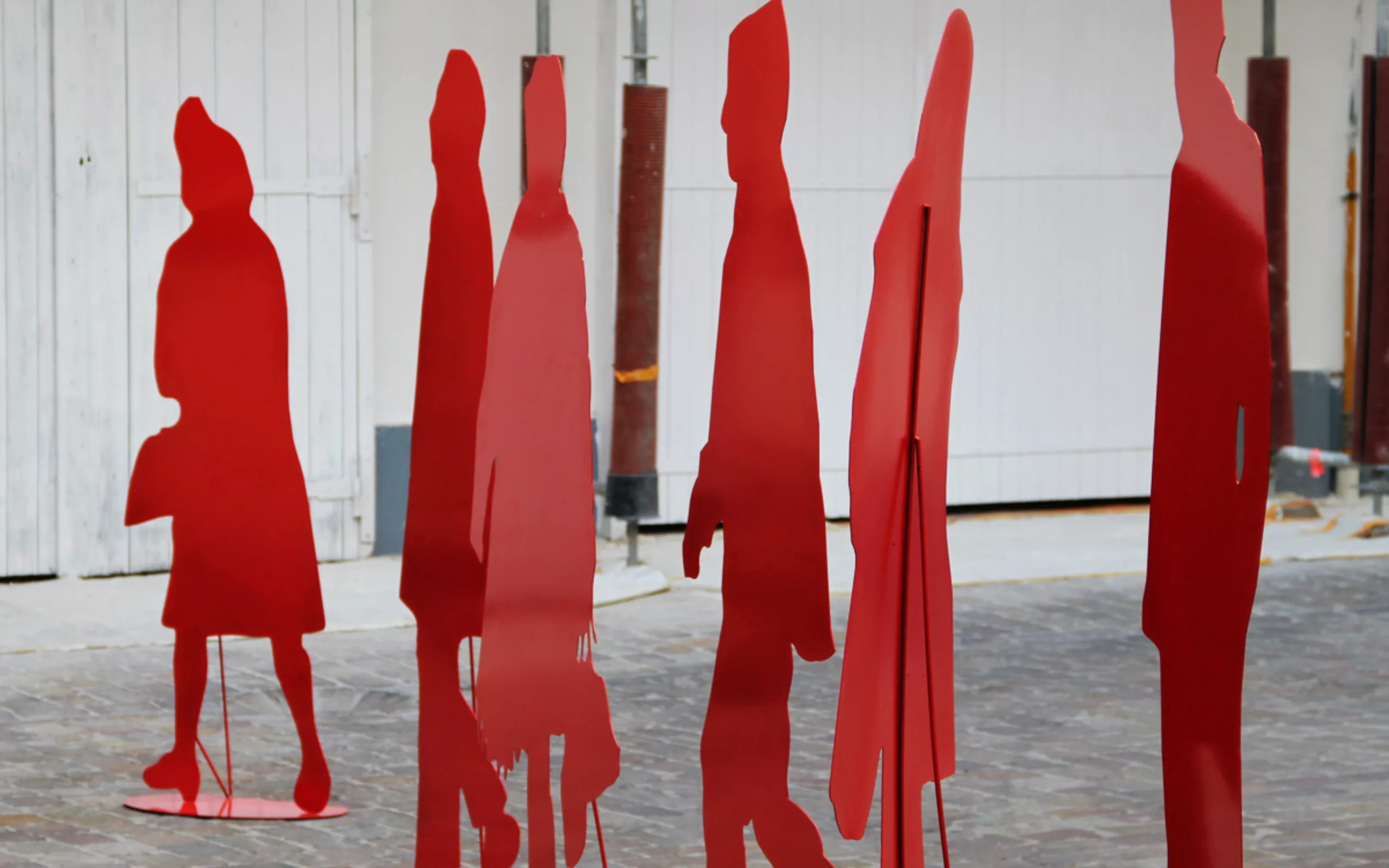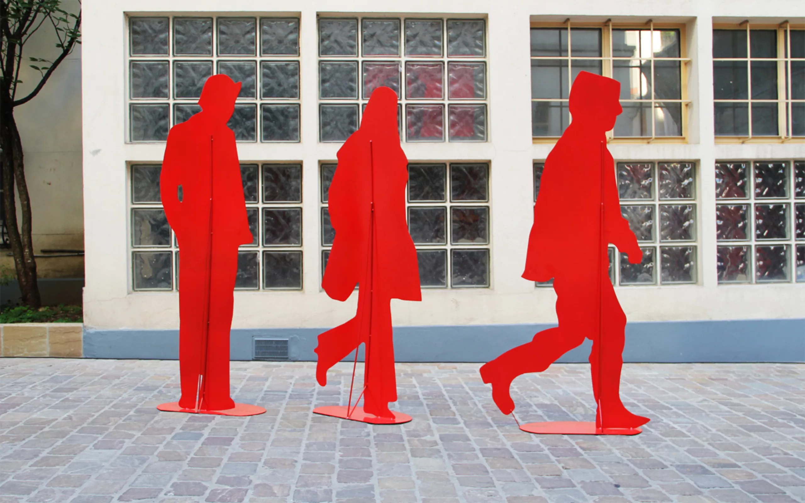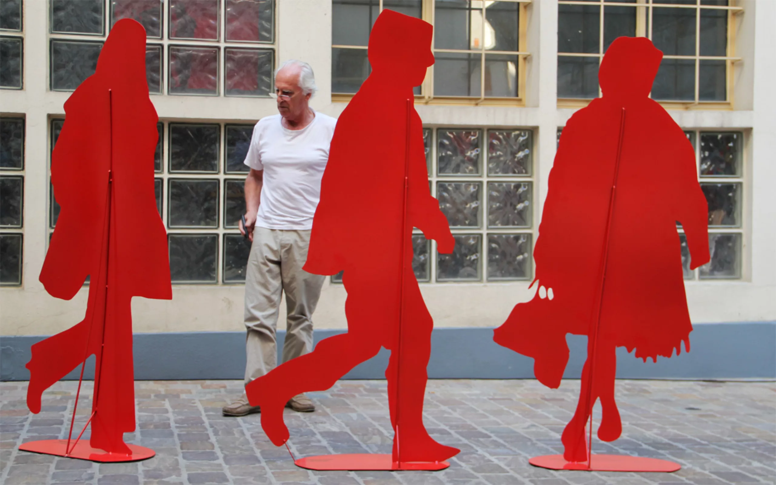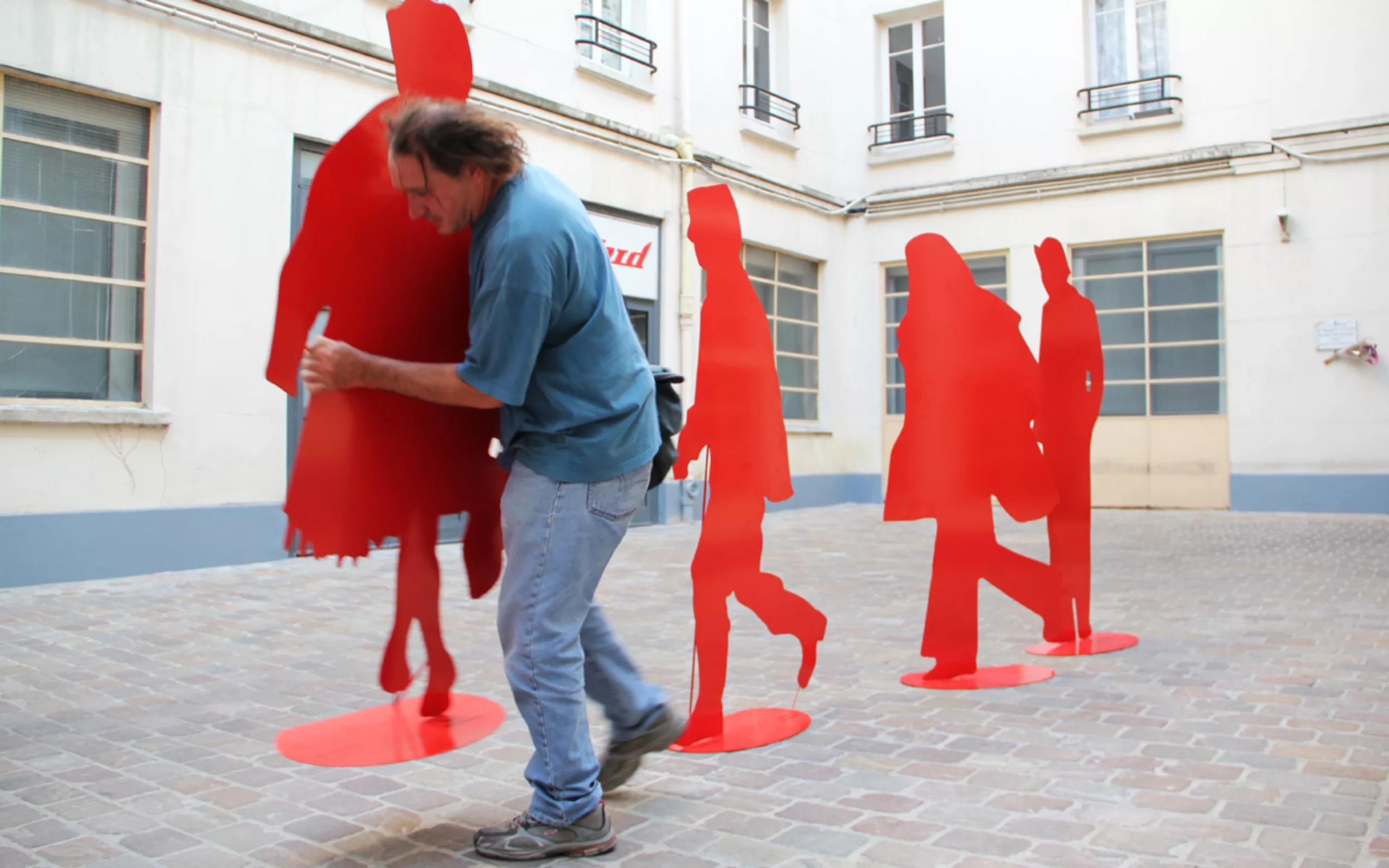 Ci-dessous, voici quelques images de notre cour d’immeuble habitée l’espace d’une après-midi de visiteurs anonymes. Ces banales silhouettes évoqueront naturellement les silhouettes vectorielles qui ont dépanné plus d’un graphiste en manque d’images. Depuis 1971 (bien avant l’invention d’illustrator !), Gérard Fromanger a entrepris de faire rougir la banalité… comme pour lutter contre elle. Un leitmotiv qui sera le début d’une longue série de tableaux… et de sculptures maintenant !