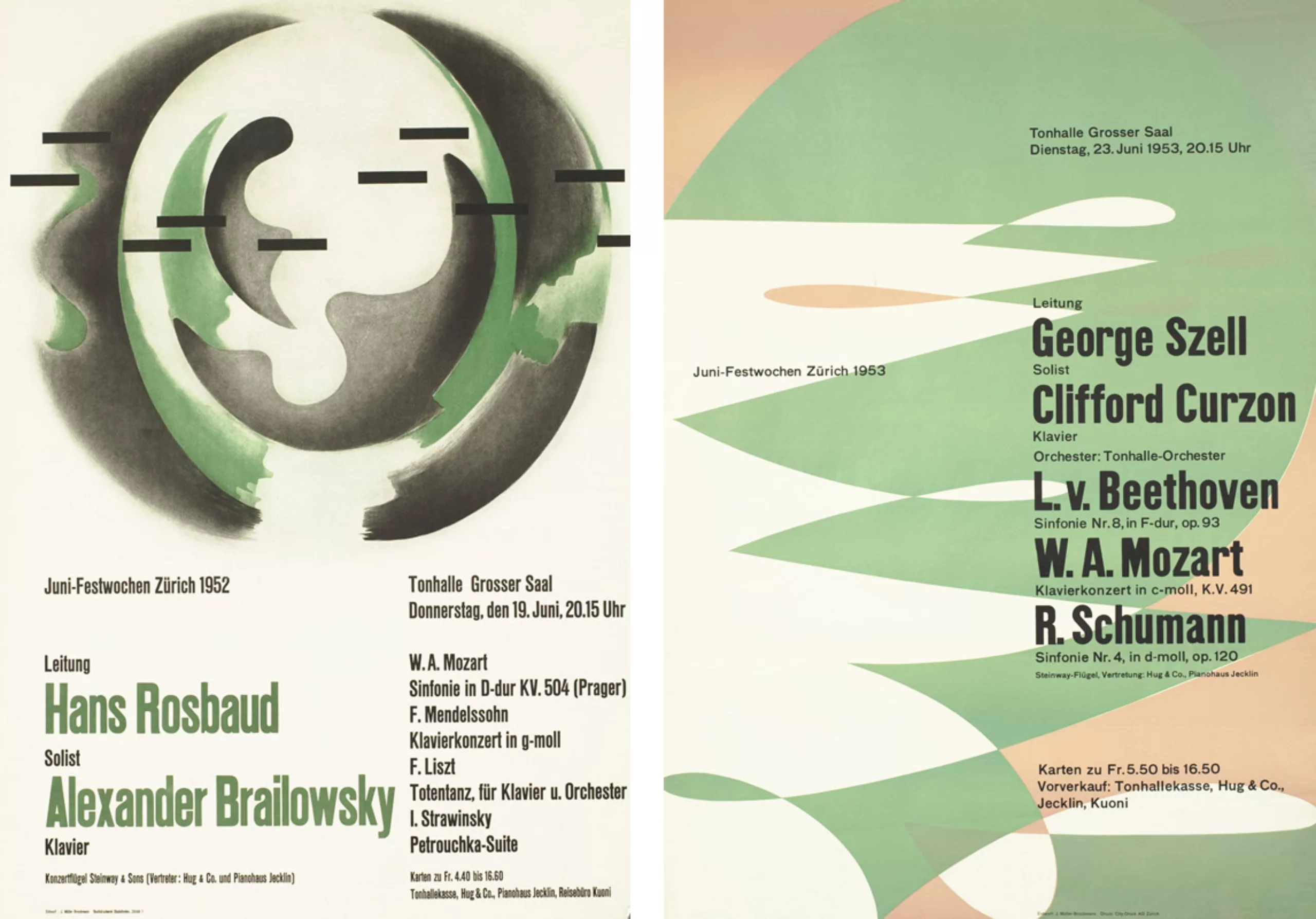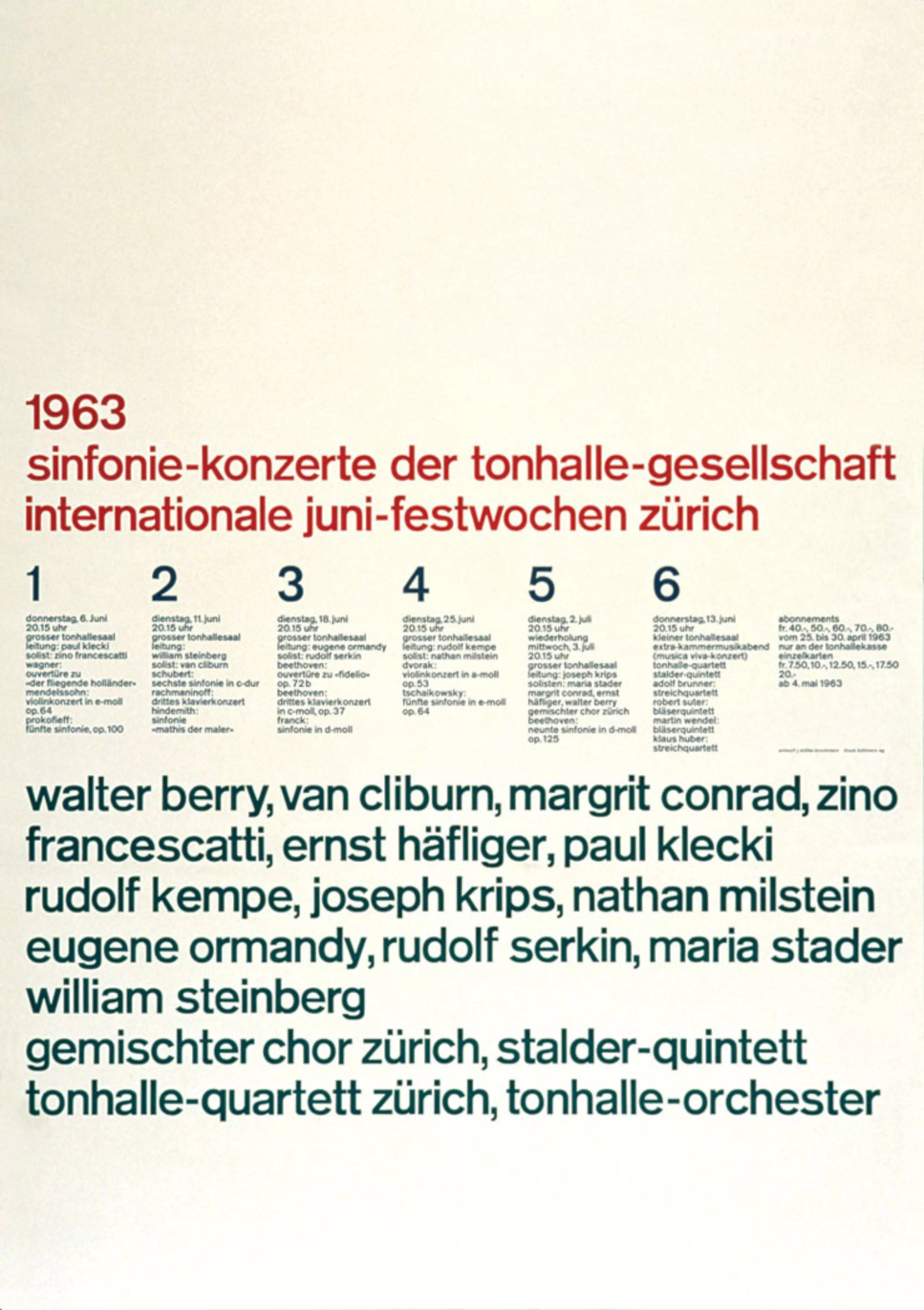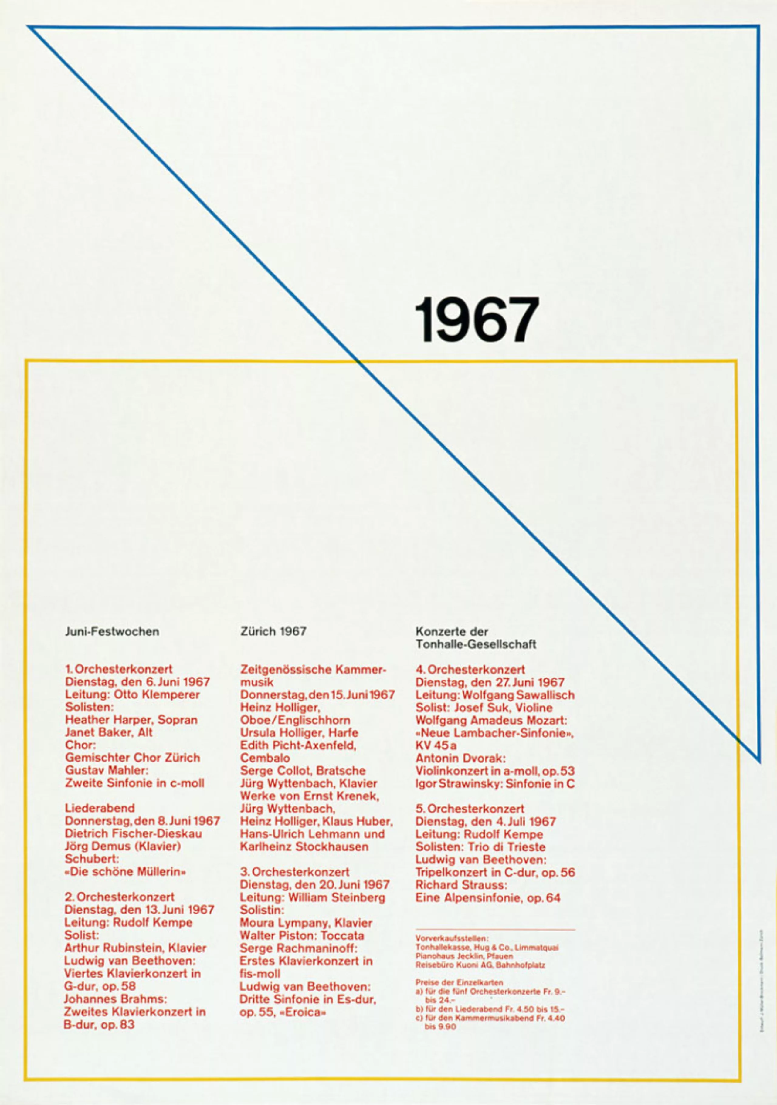 Après 1945, Müller-Brockmann concentre son travail sur l’illustration et le design d’expositions. En 1950, il conçoit sa première affiche pour la Tonhalle de Zurich. C’est à cette époque qu’il développe son approche constructiviste du graphisme. Petit à petit le graphisme occupe tout son temps. Son affiche “protégez l’enfant” pour l’Automobile club de Suisse et ses nombreuses affiches pour la Tonhalle de Zurich lui apporte une grande notoriété.