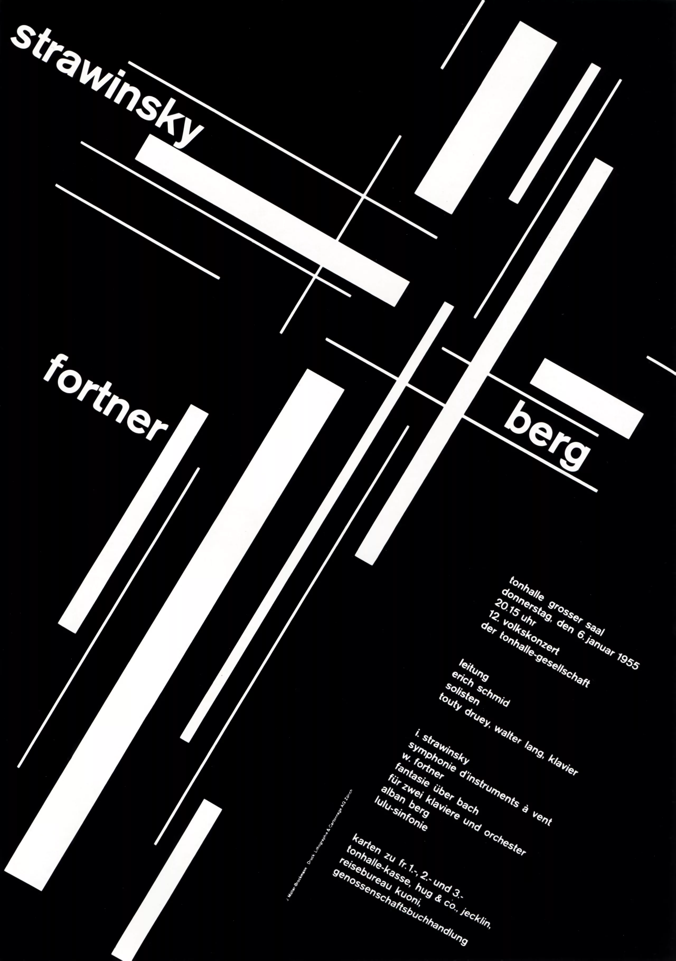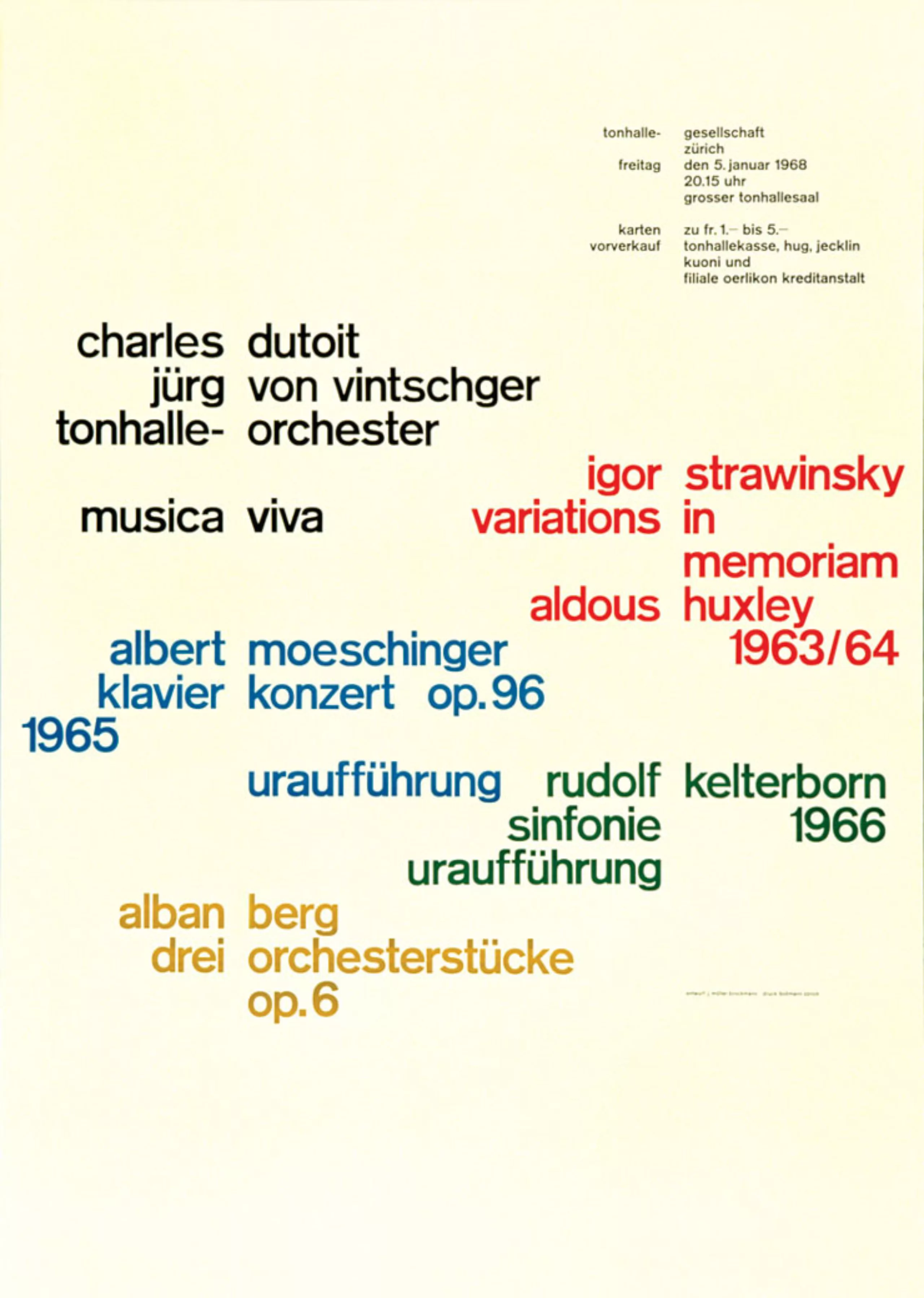 A l’époque, Brockmann est influencé par le travail du photographe hongrois Moholy-Nagy et par le manifeste “Die neue Typographie” de Jan Tschichold. Ce manifeste moderniste proclame la suprématie des polices de caractères en bâtons (appelés grotesk en Allemand). Brockmann sera fortement influencé par ces règles qu’il observera tout au long de sa carrière.