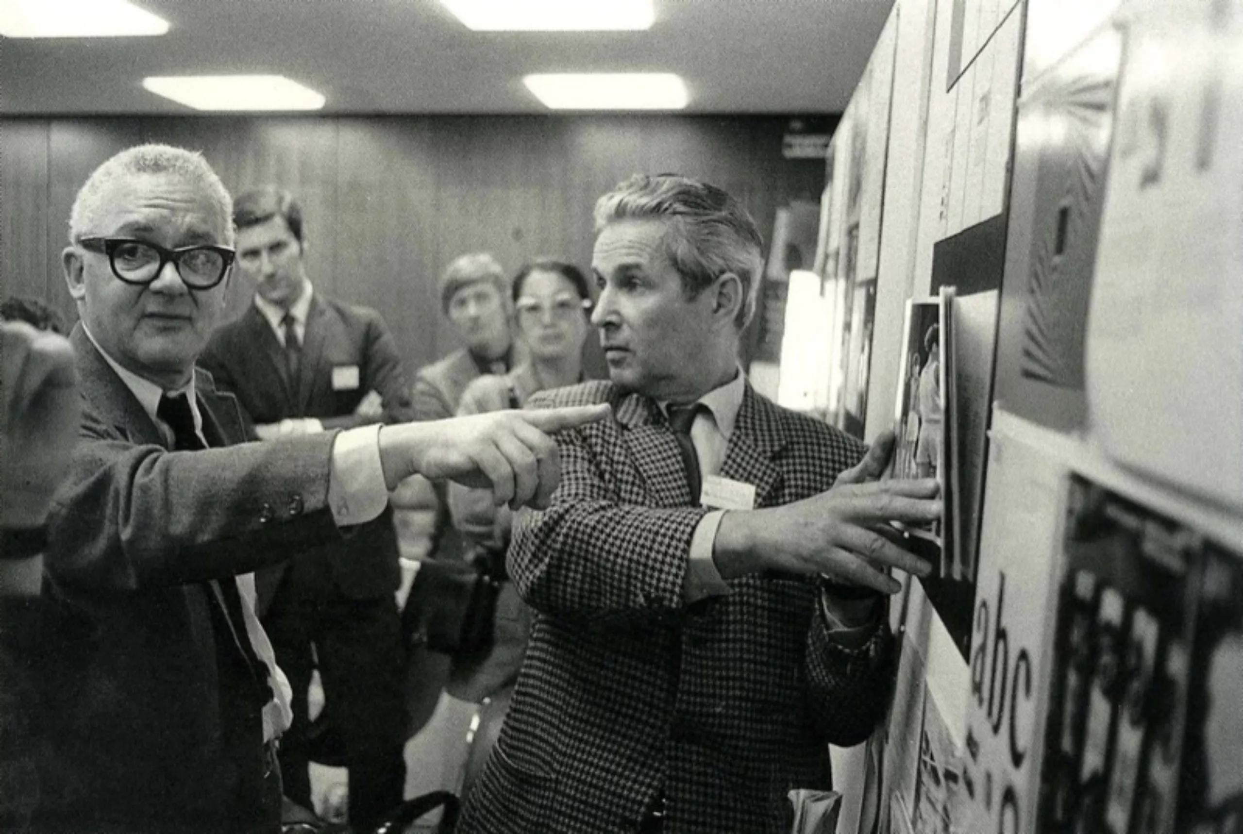 Paul Rand (à gauche) et Brockmann (à droite) pendant une séance de travail chez IBM dans les années 60