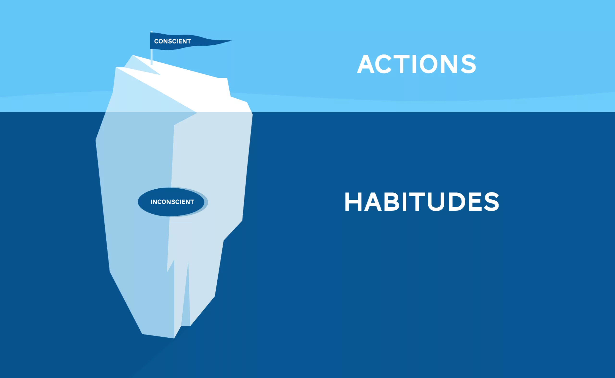 D’après lui, nos comportement et actions seraient comme la partie visible de l’iceberg. Vouloir les modifier directement demande trop d’énergie et ne mène à rien, à part à l’épuisement. Afin de les modifier, il faut s’en prendre à la partie submergée c’est à dire changer nos habitudes qui engendrent ces actions, c’est à dire créer de nouveaux réflexes inconscients.
