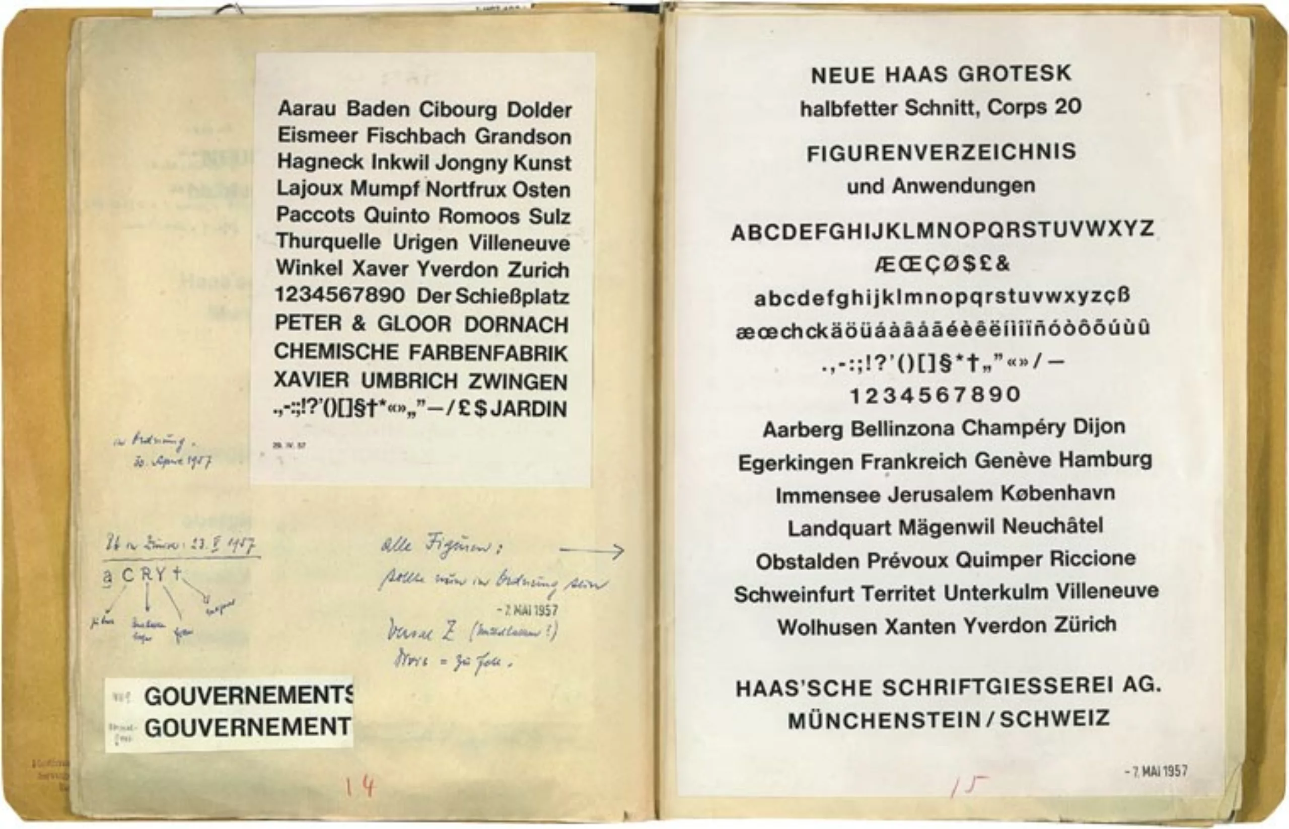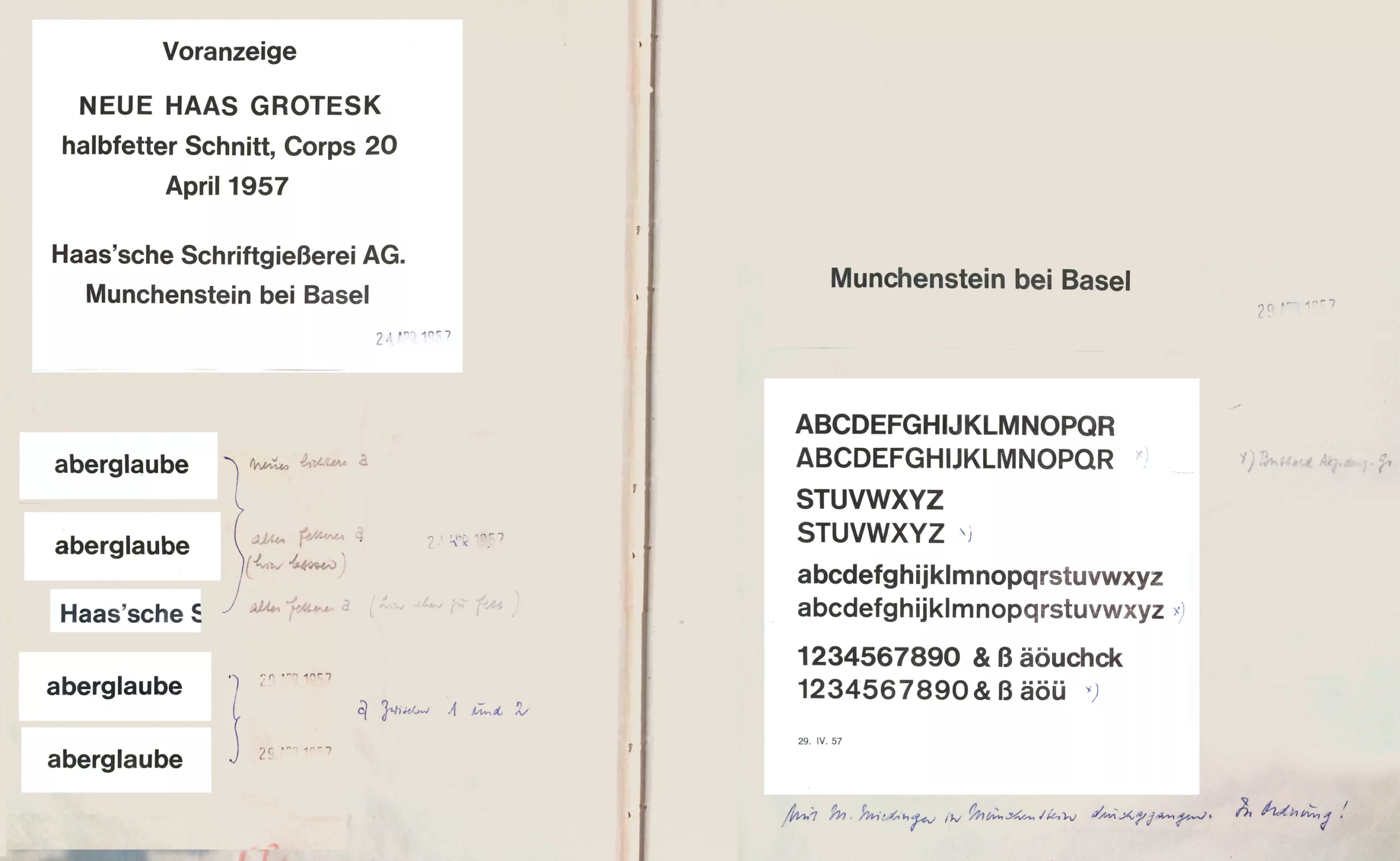 Les travaux sur le Neue Haas Grotesk ont commencé au début de l’automne 1956. Eduard Hoffmann-Feer, directeur de la Fonderie, a soigneusement consigné dans un carnet de notes les différentes étapes de la création de l’Helvetica. Il y illustre pas à pas, épreuves d’imprimerie à l’appui, le moindre changement apporté à chacune des lettres et toute la gamme des combinaisons possibles de caractères. Ce document unique en son genre fournit un aperçu détaillé de la mise au point de l’Helvetica.