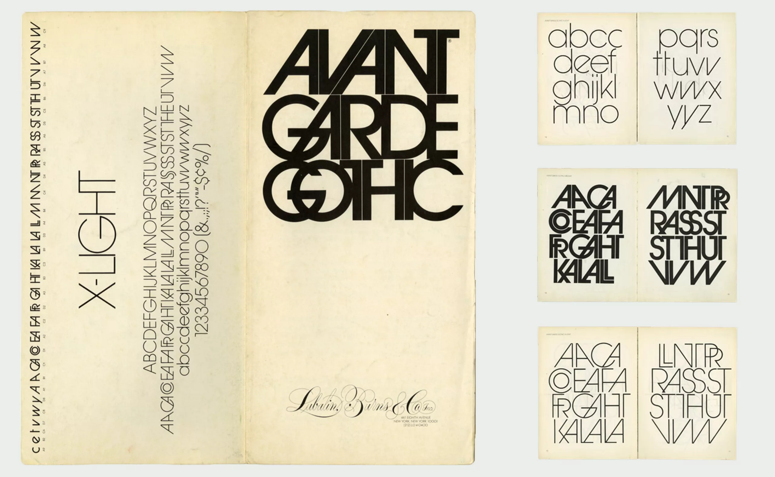 Éclectique et novateur, Lubalin se détache des anciens modèles typographiques et du style International Suisse pour favoriser l’émergence d’un nouveau graphisme grâce à l’utilisation de la photocomposition. Elle lui permet de jouer avec les lettres en renversant et superposant les caractères, de réutiliser des typographies victoriennes ou antiques et d’en inventer de nouvelles. Le logo d’Avant Garde en est un bon exemple, avec le G et le A qui deviennent une ligature. Lubalin utilise des linéales géométriques dont il réduit l’interlettrage au maximum jusqu’à ce que les lettres se chevauchent. Il crée l’alphabet complet, l’Avant Garde Gothic, qu’il décline en lettres capitales avec de nombreuses ligatures (dessinées par Tom Carnase) pour permettre de nombreux jeux typographiques. Dix ans plus tard il en dessinera une version en minuscules qu’il distribuera par l’intermédiaire de sa fonderie ITC. Lubalin est cependant consterné par l’usage qu’en font les graphistes, à part ceux d’Adidas et Audi (voir les publicités de 1970 ci-dessous) qu’il félicite directement.