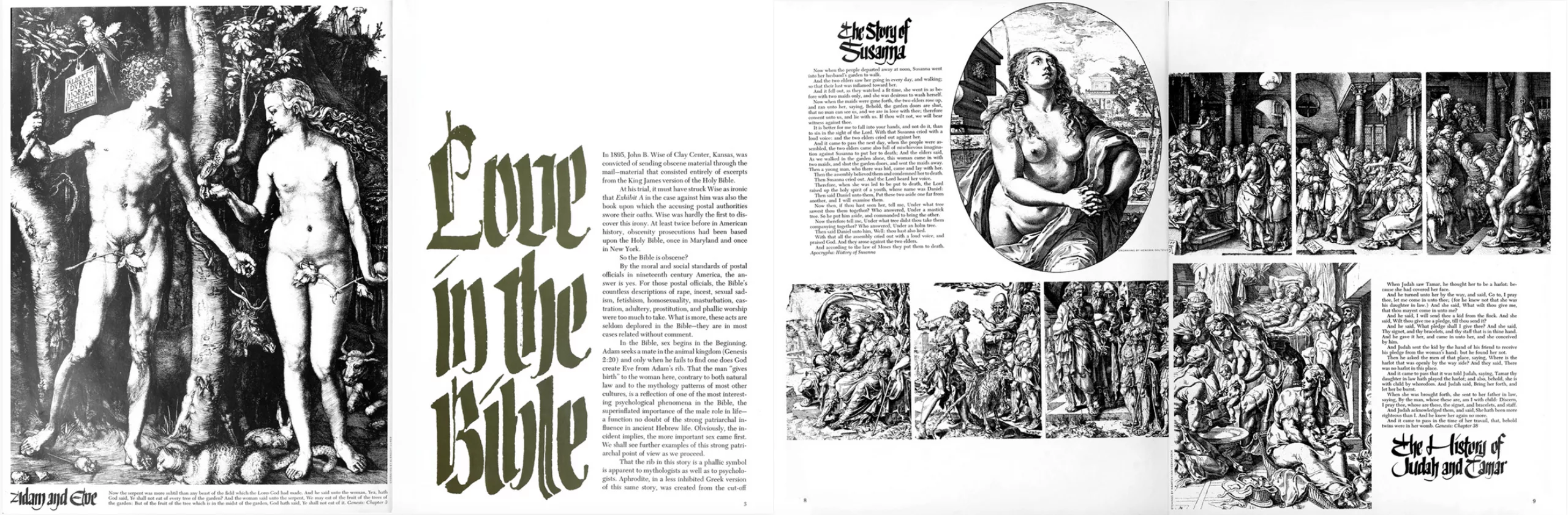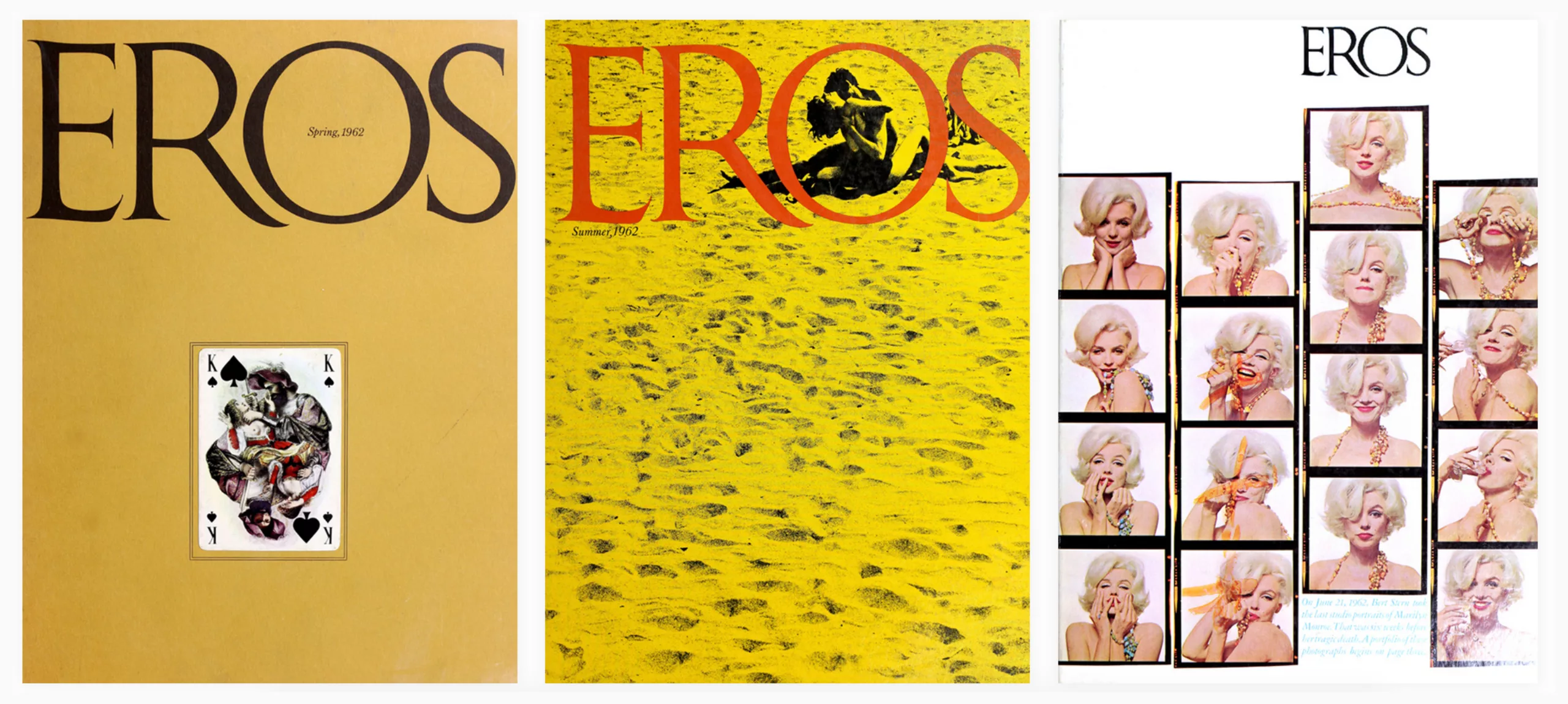 On note dans les années 60 son travail avec l’éditeur et rédacteur Ralph Ginzburg avec qui il collabore “comme des frères siamois” et réalise la conception graphique des magazines Eros en 1962, Fact: de 1964 à 1967 et Avant Garde de 1968 à 1972. Ces magazines, s’ils ne sont pas publiés longtemps, marquent cependant l’histoire du graphisme. Eros, le “magazine de l’amour” aux images érotiques et de qualité est controversé injustement comme “matériel obscène” après la publication de 4 numéros seulement, et envoie Ginzburg en prison, à laquelle échappe Lubalin. Apprécié pour la qualité de sa mise en page et son contenu, Eros rafle en 1963 plus de prix que n’importe quel autre magazine américain ! L’intérieur, consultable sur ce site et dont nous tirons les visuels ci-dessous, dévoile une mise en page riche et variée, alternant photographies et illustrations.