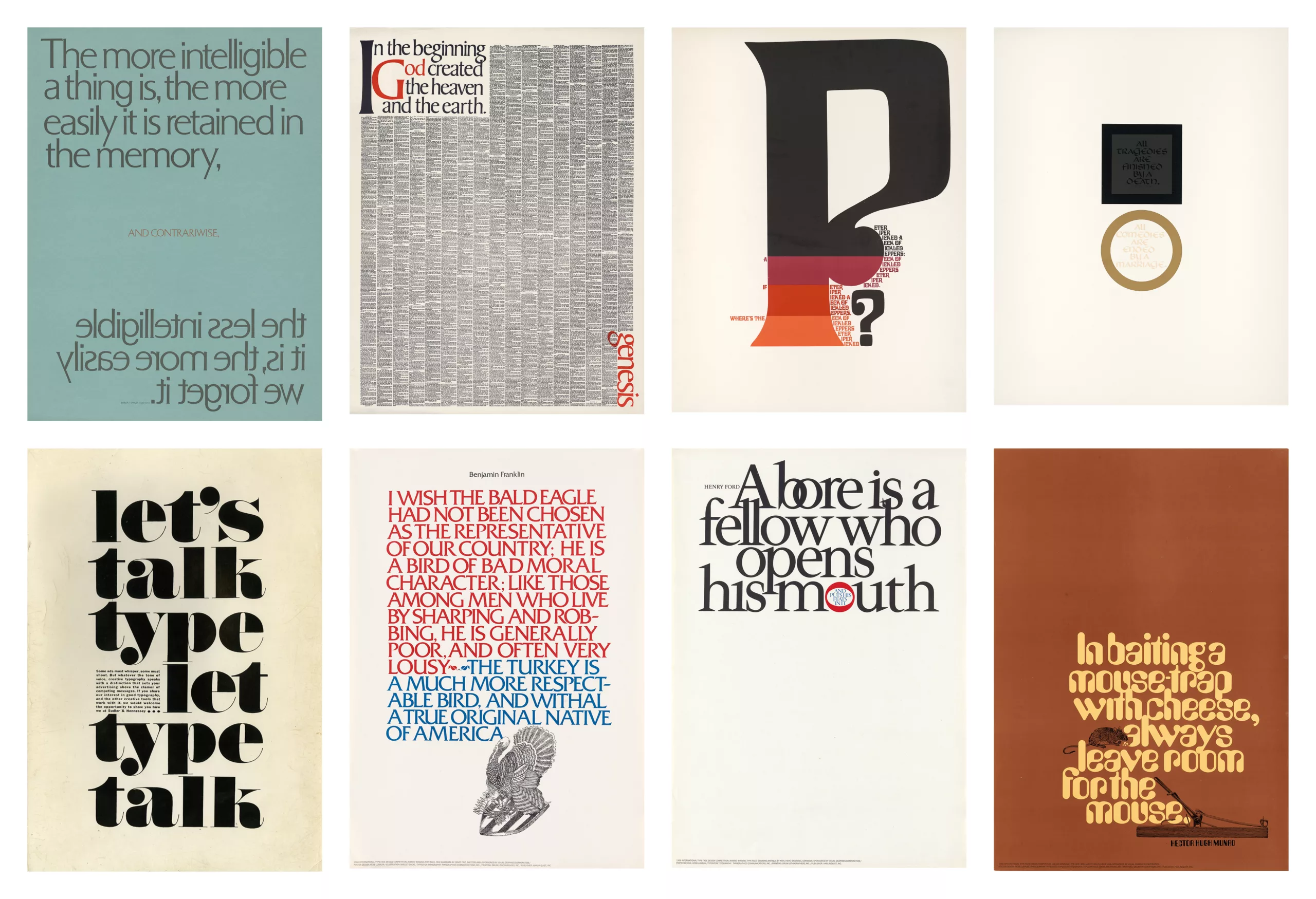 On voit ici quelques posters réalisés par Herbert Lubalin vers 1965, qui montrent l’étendue de sa maîtrise de la composition avec les lettres.