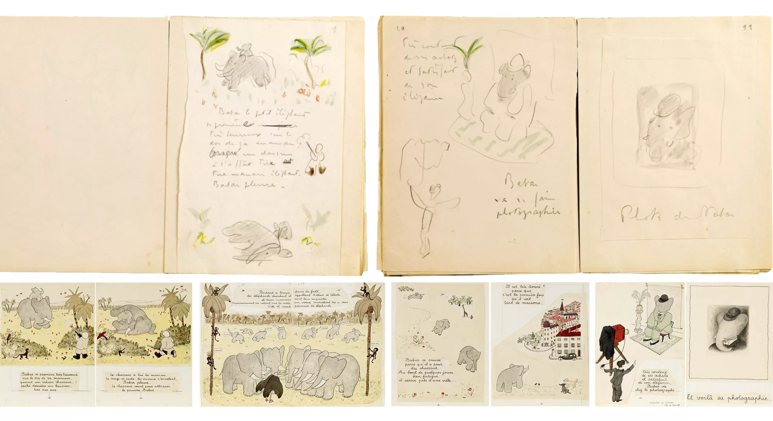 Ci-dessous, pour le plaisir et un peu hors sujet, des planches originales du premier Babar et de Blanche-Neige à voir en grand (attention spoiler, le chasseur a tué la maman) :