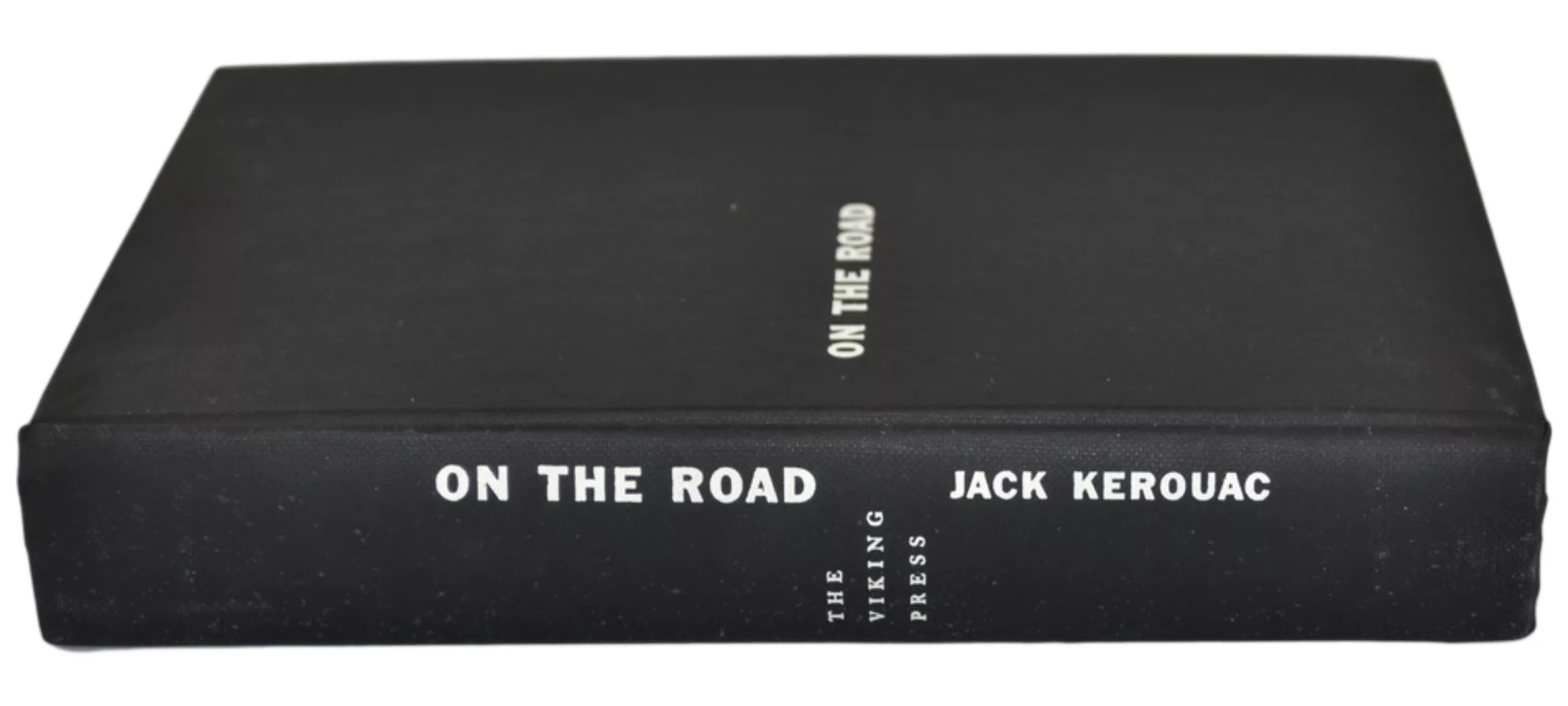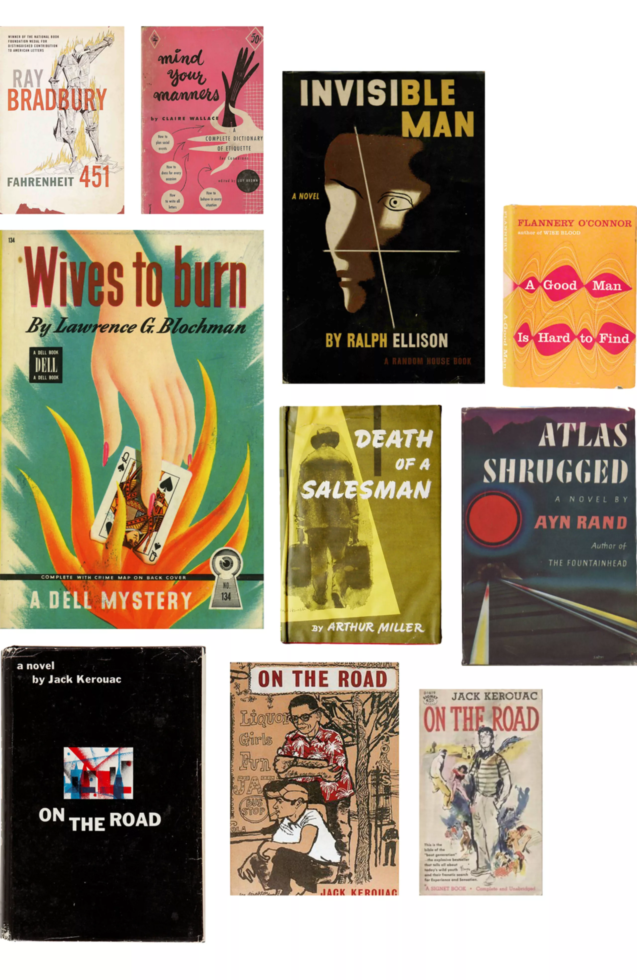 Sous les jaquettes, les livres sont sobres, mais l’on voit déjà nettement la trace du graphiste, comme sur la première édition de On the Road de Kerouac en 1957 (jaquette en bas à gauche en noir, et livre en-dessous).