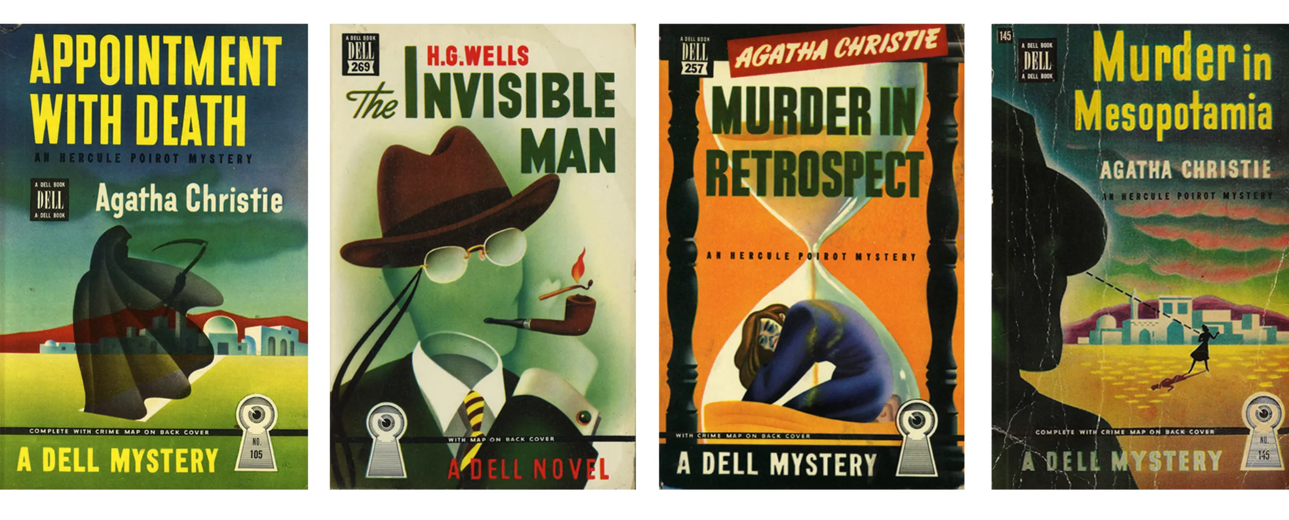 Pour aller plus loin, les illustrations surréalistes et imaginatives n’ont rien à voir avec le style ultra-réaliste de l’époque, et annoncent déjà la naissance de l’abstraction. C’est le cas de ces romans d’Agatha Christie, parus entre 1946 et 48.