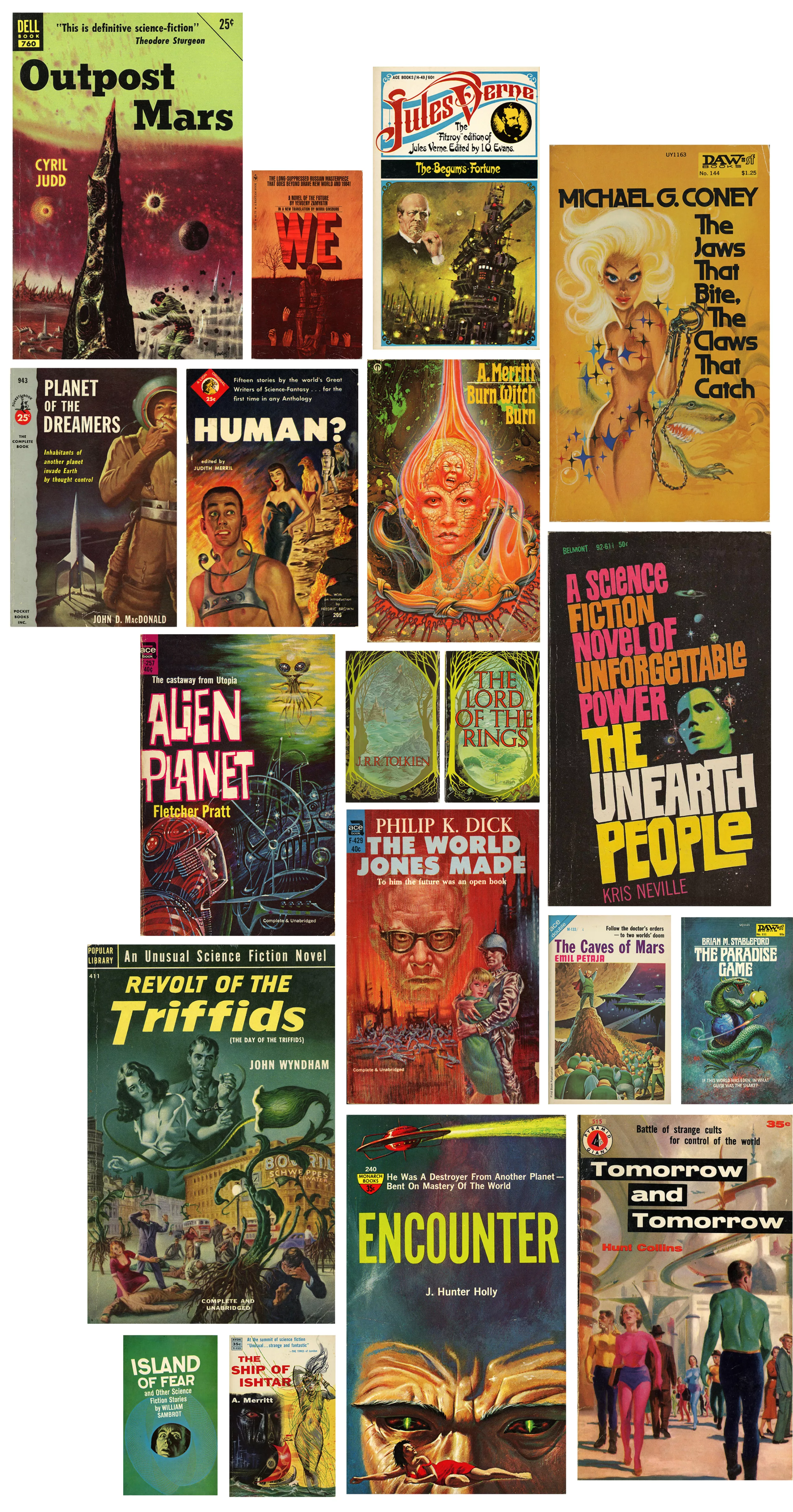 Les années 60 amènent leur lot de bouleversements avec notamment l’envie de se libérer du conformisme qui s’est installé depuis l’après seconde Guerre. C’est là un terrain propice à l’avènement de la science-fiction et des aventures fantastiques, des nouveaux genres littéraires voués à l’abstraction, que l’on retrouve bien sûr en première de couverture (à voir en grand).