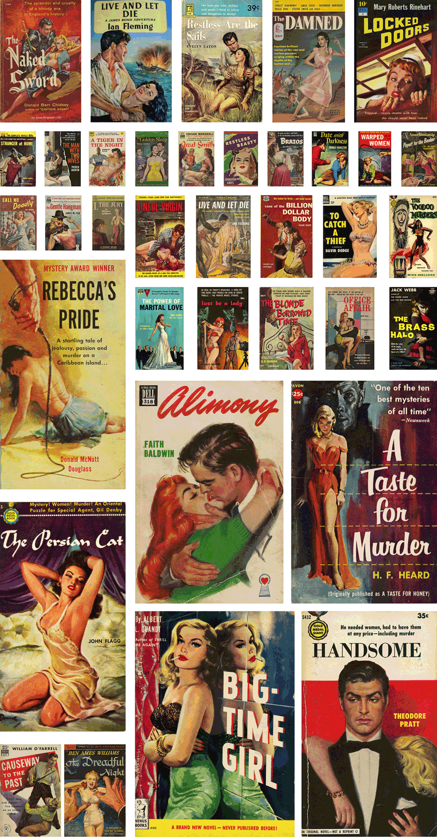 De l’autre côté de l’Atlantique, aux États-Unis, les éditions poche ont vu le jour depuis les années 40. Avec cette frénésie liée à l’accès à la consommation et aux loisirs, les éditeurs considèrent les romans d’aventure comme un quelconque objet à vendre. On applique donc les recettes qui marchent : couleurs criardes, portraits en gros plan, femmes pulpeuses et hommes virils, comme sur les affiches de cinéma et les réclames publicitaires.