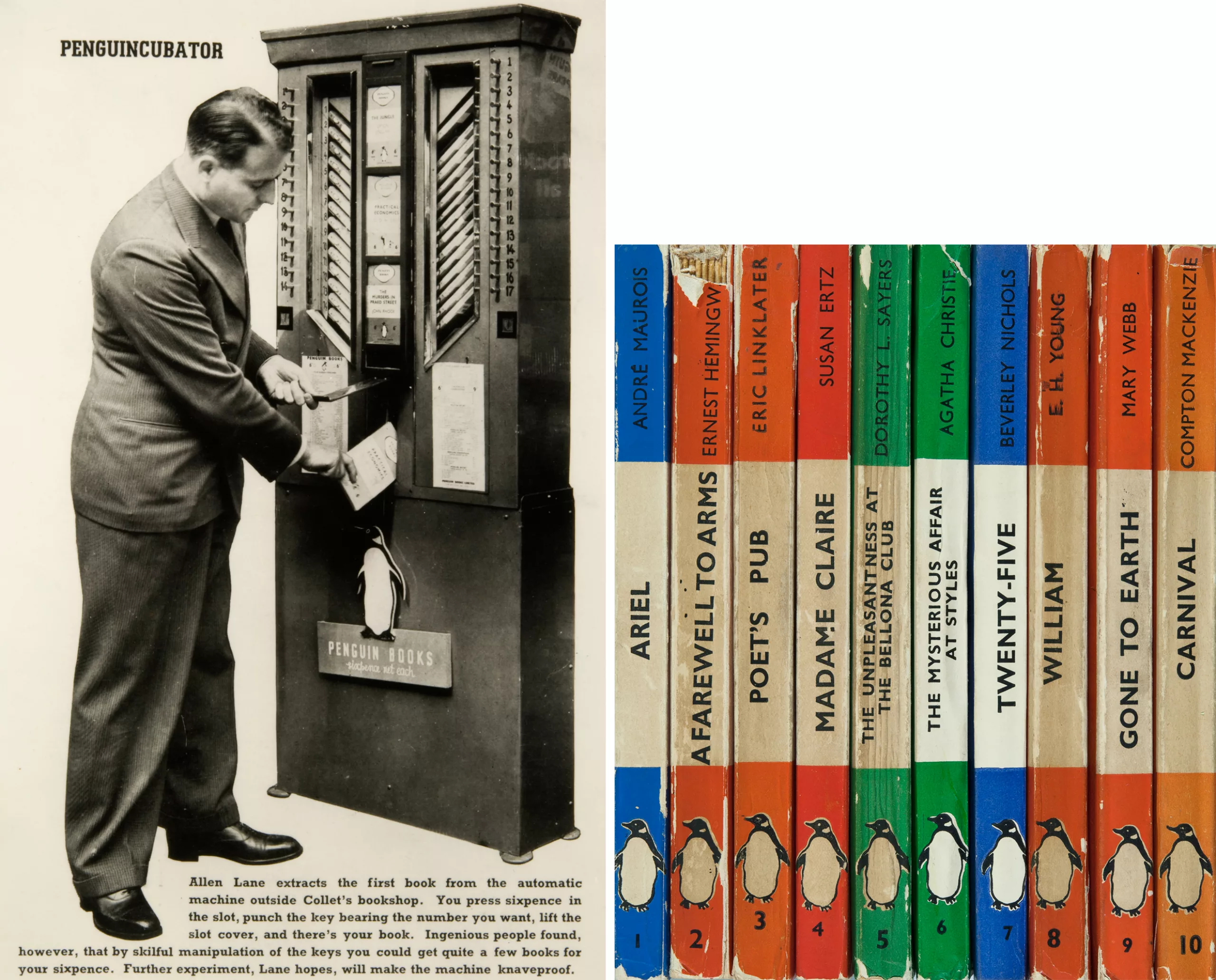 Deux ans plus tard en 1937, Allen Lane lance le “Penguincubator“, un distributeur automatique des livres poche Penguin, qu’il installe dans une rue passante à Londres. En insérant 6 pences on choisit et reçoit son livre, ou mieux, plusieurs livres, comme l’indique le petit texte sous la photo : “Certaines personnes ingénieuses se sont aperçu qu’une manipulation habile des boutons de la machine permettait de recevoir une jolie quantité de livres au-delà des 6 pences insérés. Lane espère que des tests plus poussés permettront de créer une machine résistante aux canailles.“
