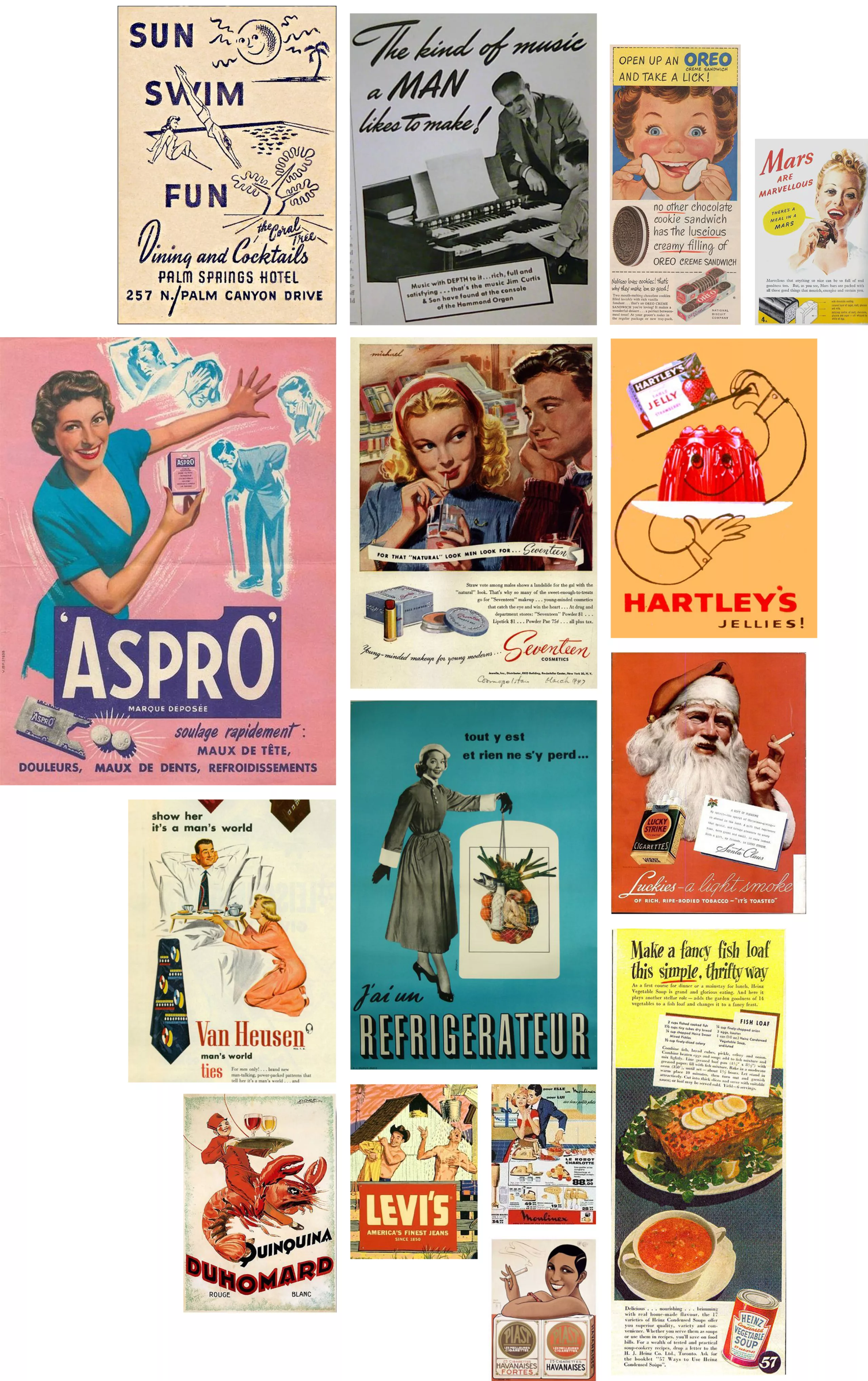 Dans l’angoisse d’une éventuelle nouvelle catastrophe nucléaire, c’est la frénésie chez les acheteurs américains. Il faut plus, mieux, plus beau, pour faire plus vite, et “keep up with the Joneses” (épater les voisins). La photographie n’est pas encore d’usage, et l’on retrouve encore les illustrateurs du côté des publicités, des affiches ou des couvertures de livres.