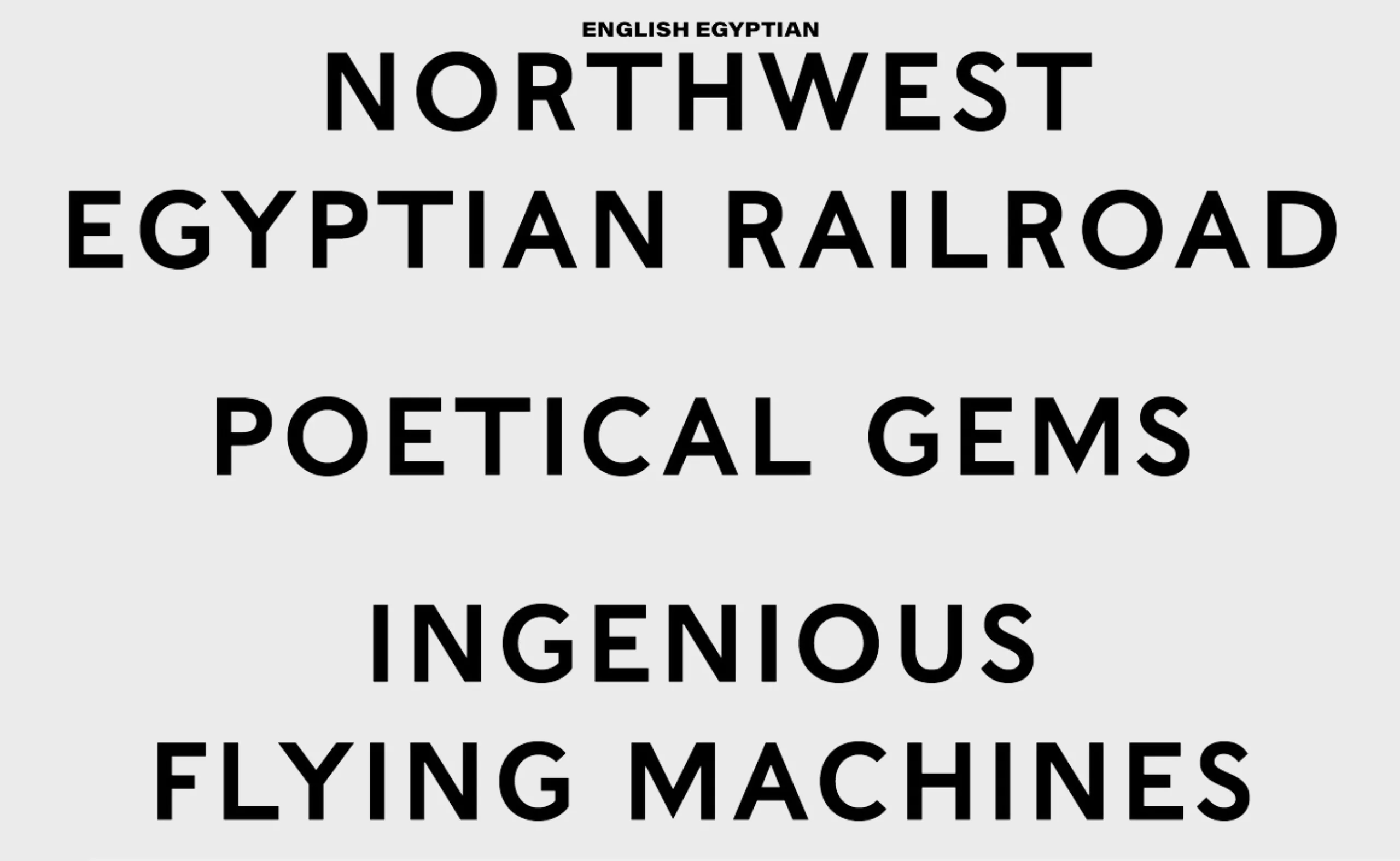 Il faut savoir que dès 1816, l’Angleterre, qui est en avance dans ce monde moderne, a inventé spécialement pour la publicité et la presse les premiers caractères sans empattements, qui ont l’avantage d’être plus lisibles et simples, dans ce flot graphique. Le Two Lines English Egyptian de la fonderie William Caslon en sans-serif et majuscules voit le jour ; à l’époque le mot “Egyptiennes” est une catégorie pour les caractères nouveaux et différents.