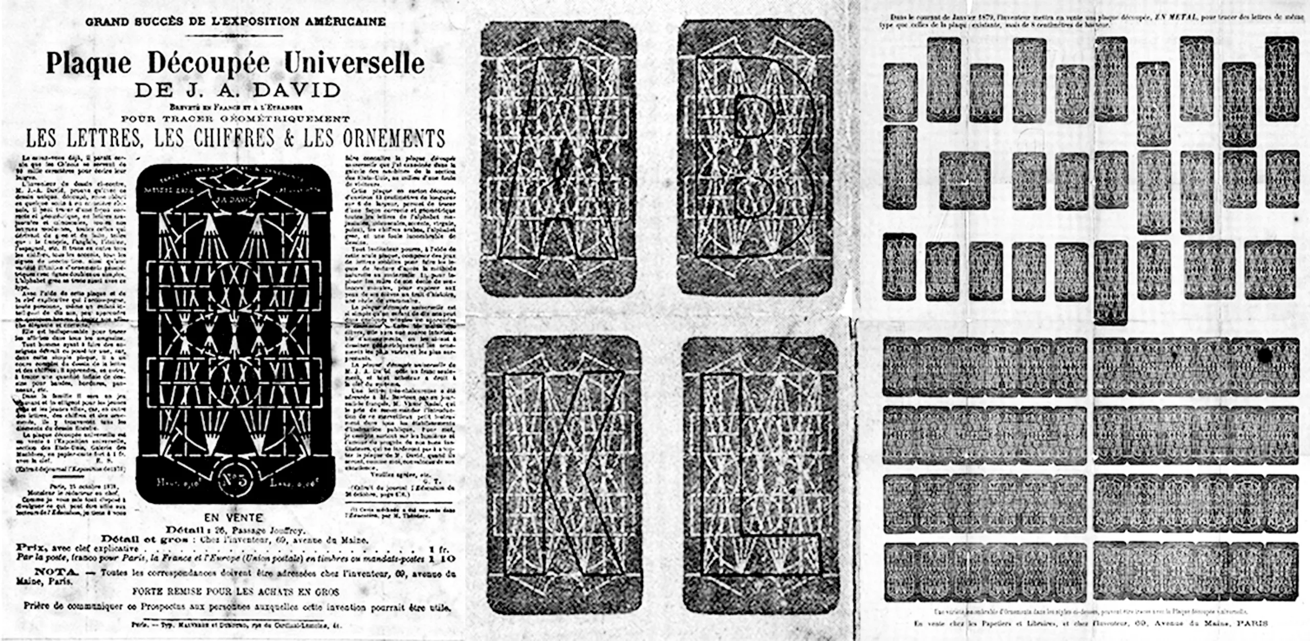 En 1876, Joseph A. David, un ingénieur américain, pousse le processus un peu plus loin en inventant la Plaque Découpée Universelle. C’est une plaque de métal pochoir aux formes géométriques circulaires et linéaires qui permet de dessiner des caractères géométriques sans empattements, conçue comme objet pédagogique pour les écoles primaires. Cet objet rassemble la pensée rationnelle et plastique (artiste / artisan ou ingénieur / typographe) fondatrice du mouvement moderniste, qui servira plus tard aux dessins des premières linéales géométriques du Bauhaus.