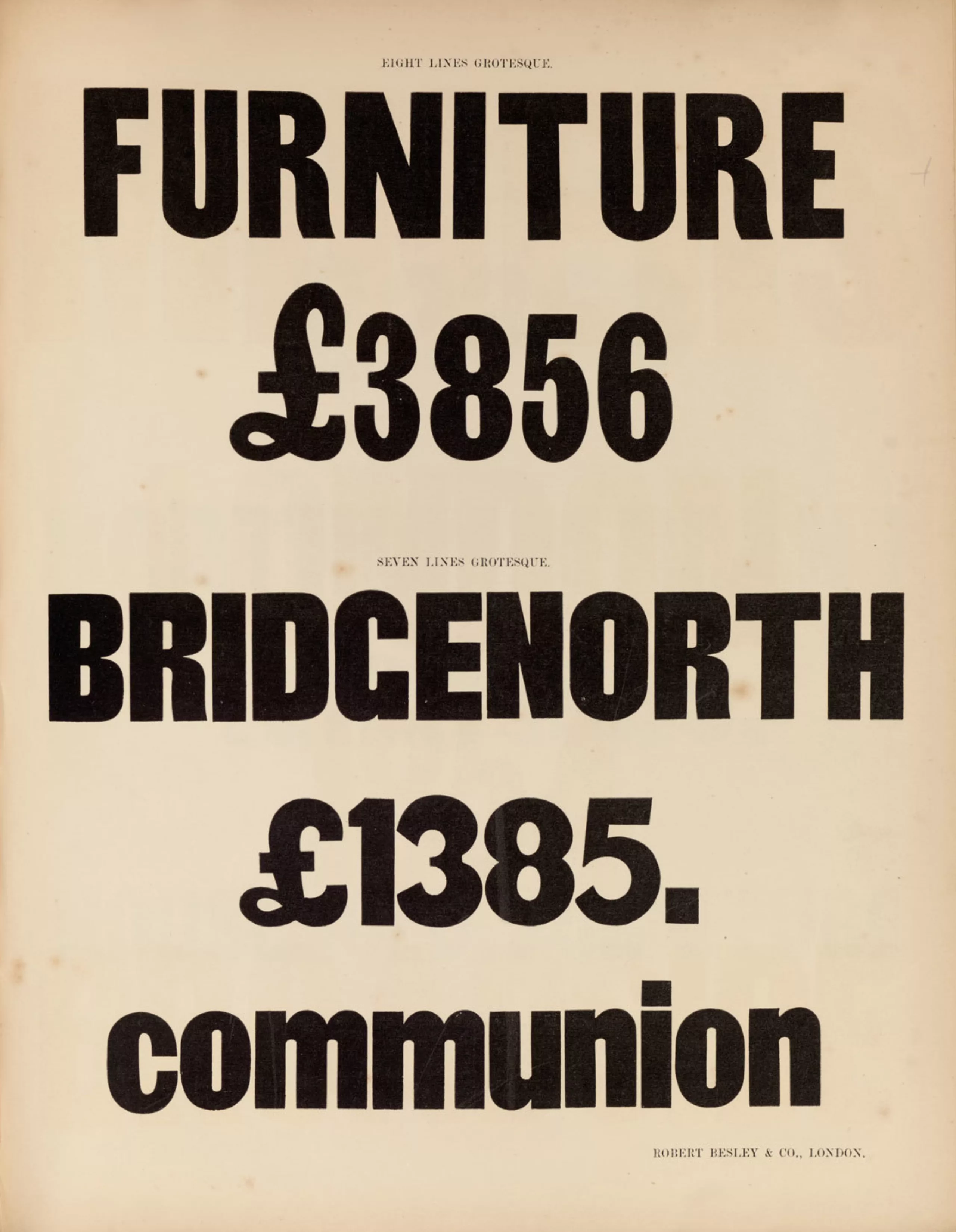 Ces premiers caractères sans ornementations sont créés pour des questions de lisibilité et sont généralement utilisés uniquement dans les titres. On dessine les lettres les plus grosses possibles dans le moins d’espace possible. Ces caractères sont appelés grotesques en comparaison avec les lettres Romaines, plus sophistiquées… ce nom indique leur valeur intrinsèque et le peu de valeur qu’on leur accorde. S’ils marquent le début des linéales -qui révolutionneront un siècle plus tard le paysage graphique moderniste en tant que caractères “universels”- ils sont encore bien loin de faire l’unanimité.