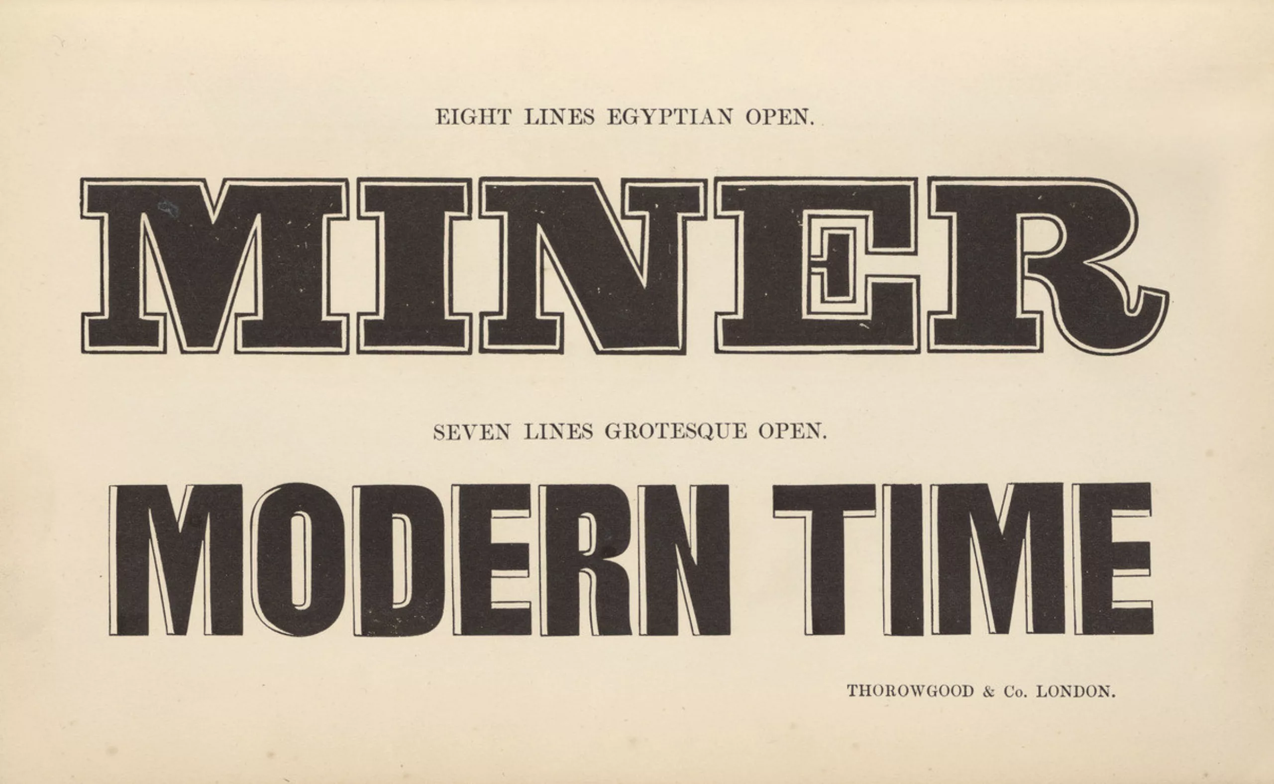 Plus tard, c’est le “Seven Line Grotesque” de Thorowgood qui se démarque avec les premiers caractères bâtons et gras déclinés en minuscules, en 1832. Plus neutres, sans ornements ni connotations culturelles, ces caractères monolinéaires sont en rupture totale avec les caractères gothiques, romains ou elzévir utilisés jusque-là en calligraphie et dans l’impression, et sont de ce fait une révolution graphique… même si elle passe probablement assez inaperçue !