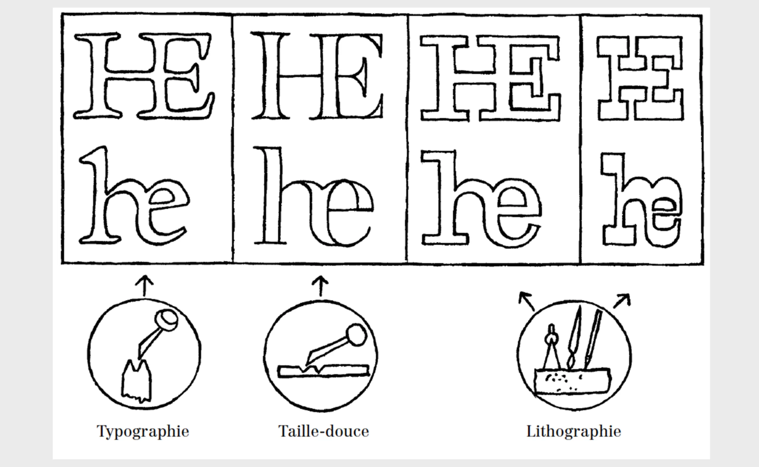 L’augmentation des biens ainsi créés et les progrès technologiques stimulent en parallèle la demande publicitaire en occident. L’invention de la lithographie (technique d’impression tracée à main libre sur une pierre poreuse) fin XVIIIe a libéré moins d’un siècle plus tôt le geste du poids du burin utilisé jusqu’alors pour tailler les caractères mobiles dans du métal ou dans la pierre. Alors que l’on imprimait jusque-là des lettres inspirées des capitales Romaines, rigoureusement dessinées et gravées selon des grilles de construction, puis calées dans une presse et accompagnées d’ornements, on peut désormais se libérer des contraintes du passé. Illustrateurs et typographes créent à main libre des empattements et déliés innovants et dessinent sur le même support, ou taillent de grosses lettres fantaisistes dans du bois, pour les réclames, réalisées à la main. Et la révolution ne concerne pas seulement les lettres.