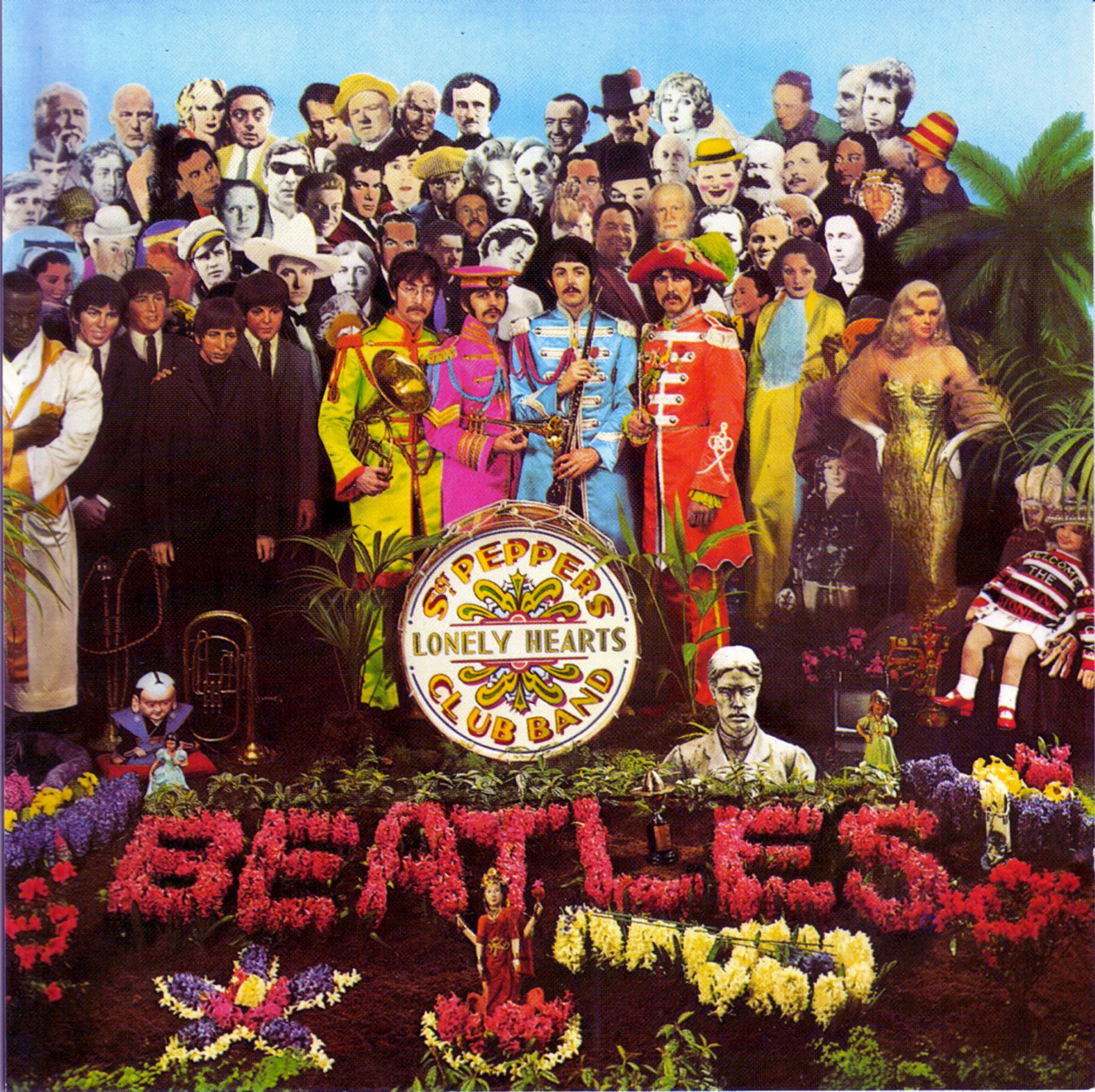 Pour également éviter des procès éventuels, le groupe demande les droits d’image à toutes les stars encore vivantes. La plupart accepte. Parmi les 71 personnalités, dont Bob Dylan, Einstein (caché derrière Lennon), Marlon Brando, Carl Gustav Jung ou Edgar Allan Poe, 12 seulement sont des femmes (la plupart des bimbos ou des actrices comme Marilyn Monroe) au grand regret de Jann, dont 3 à l’effigie de Shirley Temple qui refusera d’ailleurs abord d’apparaître sur la pochette jusqu’à ce qu’elle écoute l’album. Le musée de cire Madame Tussauds prête même ses 4 Beatles pour le décor (à gauche, en costume cravate), avec quelques autres personnages dont Diana Dors (à droite, en robe dorée). L’artiste a également l’idée de faire pousser le nom du groupe dans un parterre de fleurs.
