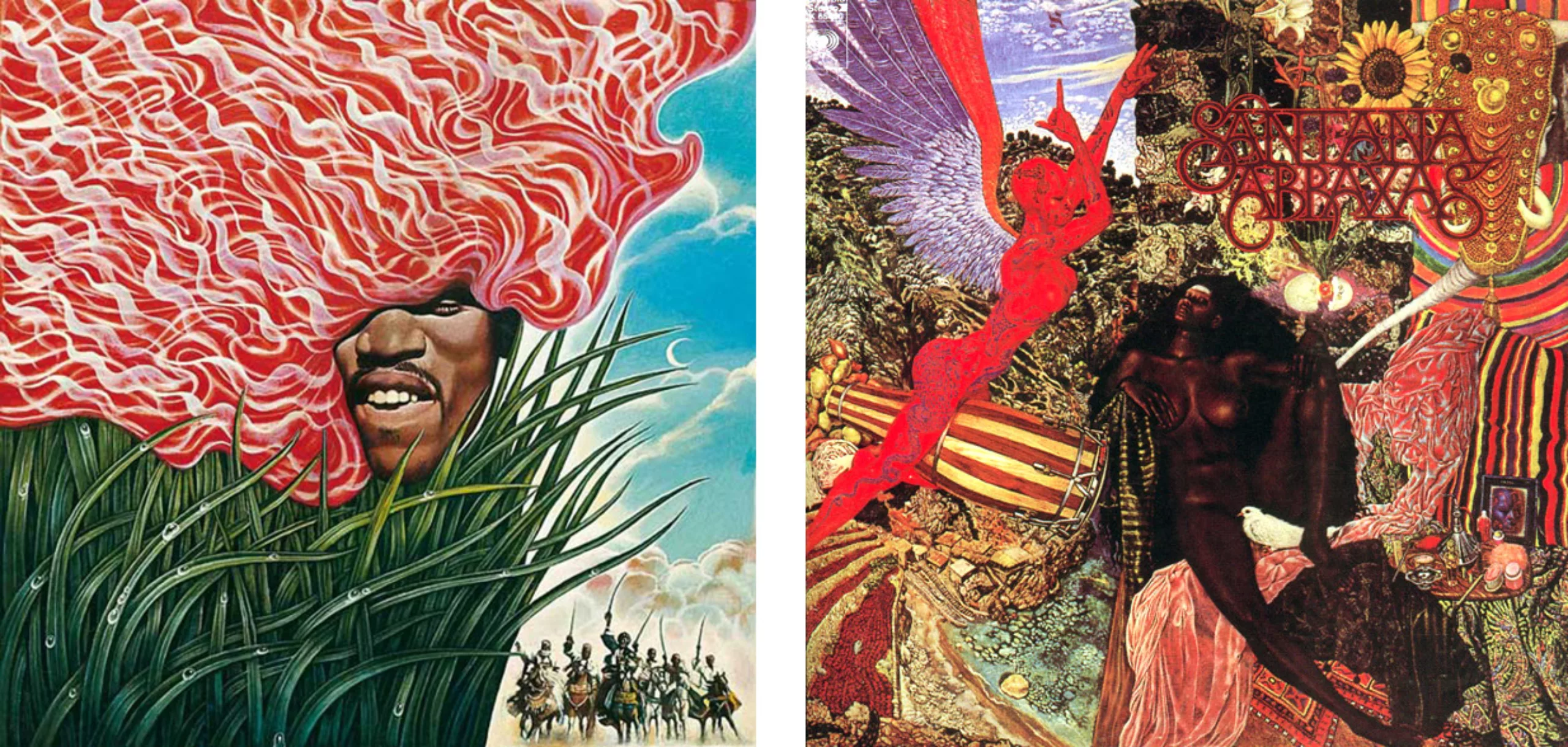 On lui doit les pochettes du Bitches Brew (1970) et Live-Evil de Miles David (1971) ci dessus, ou le mythique deuxième album de Santana, Abraxas, en 1970, tiré de l’illustration l’annonciation qu’il avait réalisée à son arrivée à New York à l’âge de 28 ans (tableau ci-dessous), ainsi qu’une illustration pour un album de Jimi Hendrix (tout en bas à gauche) qui n’a jamais vu le jour à cause de la mort du musicien.