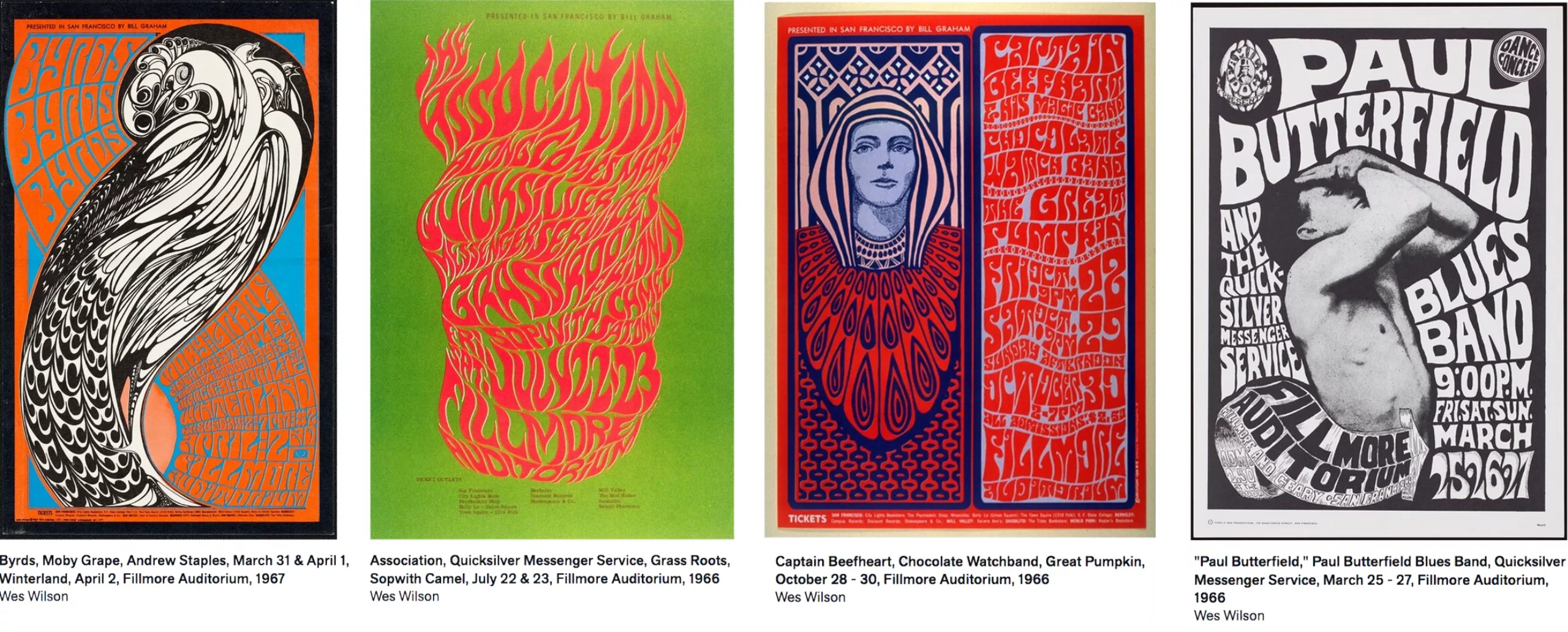 L’art de Wilson devient vite incontournable et on parle de lui comme le père des affiches de concerts et festivals rock américains (voir la galerie complète du musée des beaux arts de San Franciso). Il produira presque 60 posters en 14 mois ! Le style psychédélique est une réaction graphique à l’exact opposé du tracé rigoureux des affiches commerciales et des photos ventant les biens de consommation de l’époque, avec des lettres courbes illisibles tracées à la main et prenant tout l’espace disponible, comme le faisaient les artistes de la Sécession. On voit d’ailleurs qu’il reprend la même typographie aux formes carrées de Roller qu’il s’amuse à déformer (l’affiche Secession de Roller, 3e en partant de la gauche sur l’image du haut, et dessous l’affiche de gauche et l’affiche rouge et bleue).