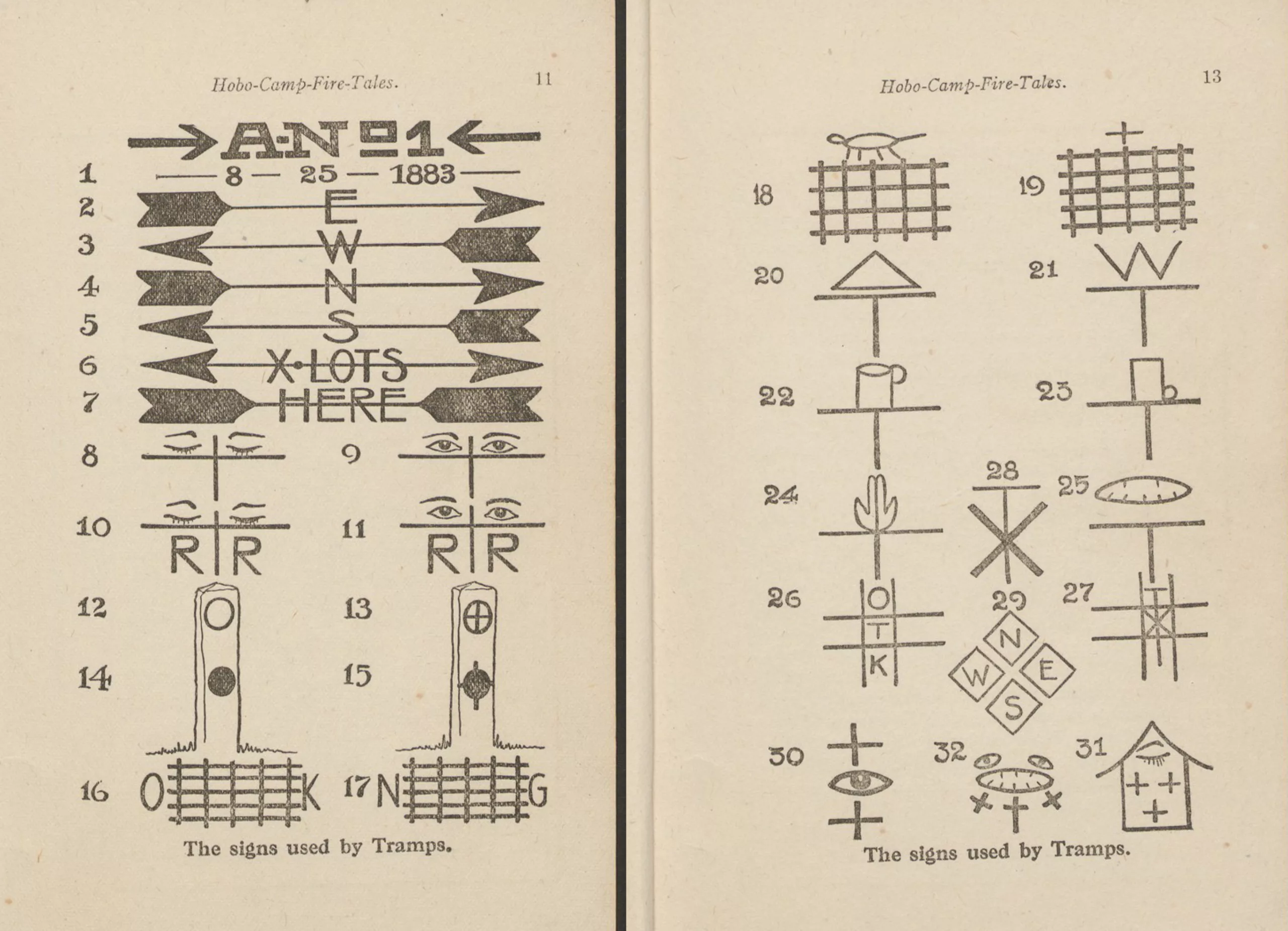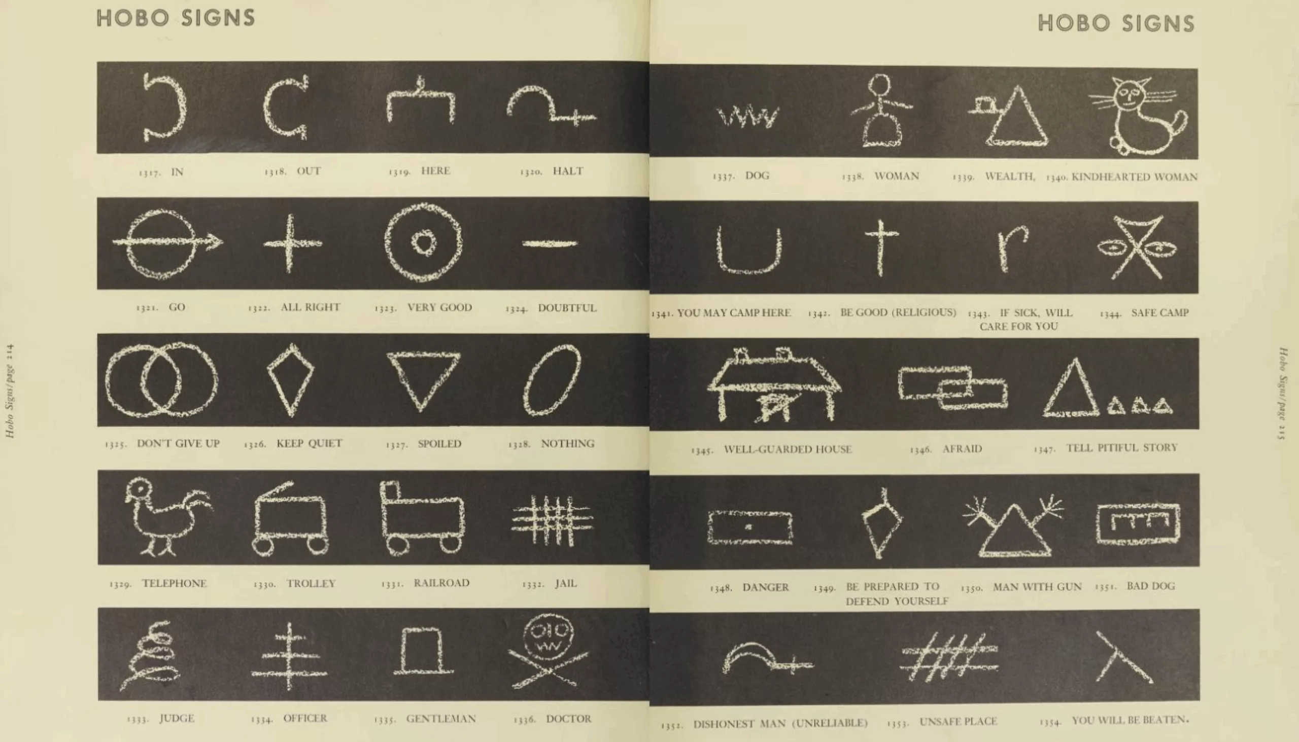 Le “vagabond A-N°1”, auto proclamé “le plus connu des hobos“, raconte ses péripéties dans son livre The ways of the hobo dans lequel il décrypte certains de ces signes. Il explique que les vagabonds sont “dans leurs relations gouvernés par des lois et des règles non écrites qu’ils respectent bien plus que les lois dictées par la “société” qu’ils qualifient d’agaçantes”. On peut bien sûr douter de sa franchise, du moins du fait que ce soit une liste non exhaustive, étant donné que ces sigles sont censés rester secrets. On trouve des symboles qui signifient par exemple “si vous êtes malade, cette personne s’occupera de vous” ou “prison crado” (certains hobos en manque de nourriture passaient volontiers une nuit en prison pour être au chaud et avoir à manger).