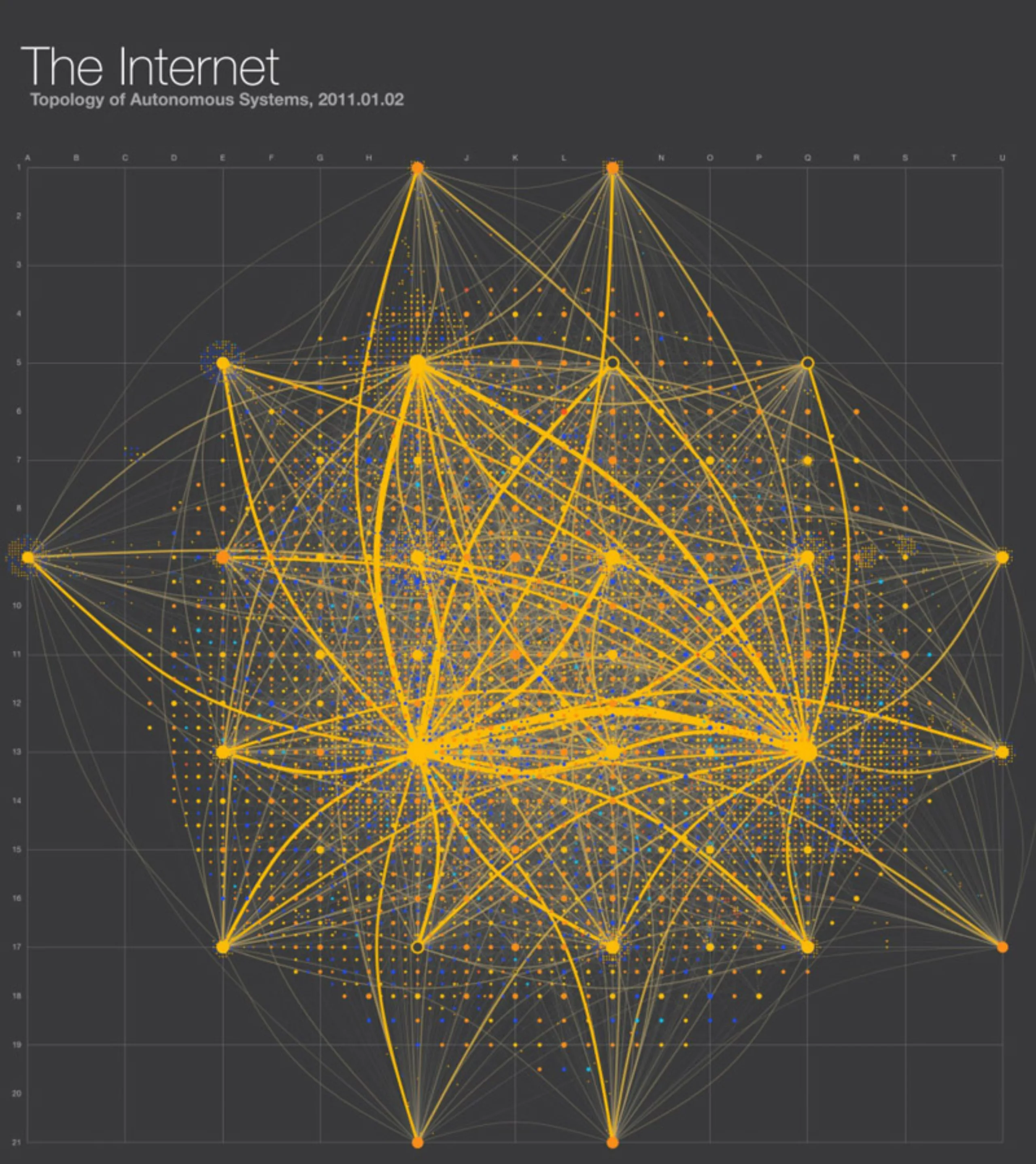 Cette carte d’internet publiée par un hébergeur canadien présente les interconnexions des réseaux ( Fournisseurs d’accès, les réseaux universitaires, les points d’échanges, ainsi que les privés (Google,Facebook..etc). Il en résulte une carte représentant 19 869 nœuds, reliés par 44 344 connexions. La légende permet de bien comprendre l’infographie. Vous y trouverez ainsi les coordonnées de chaque entreprise/université/Réseau d’échange…