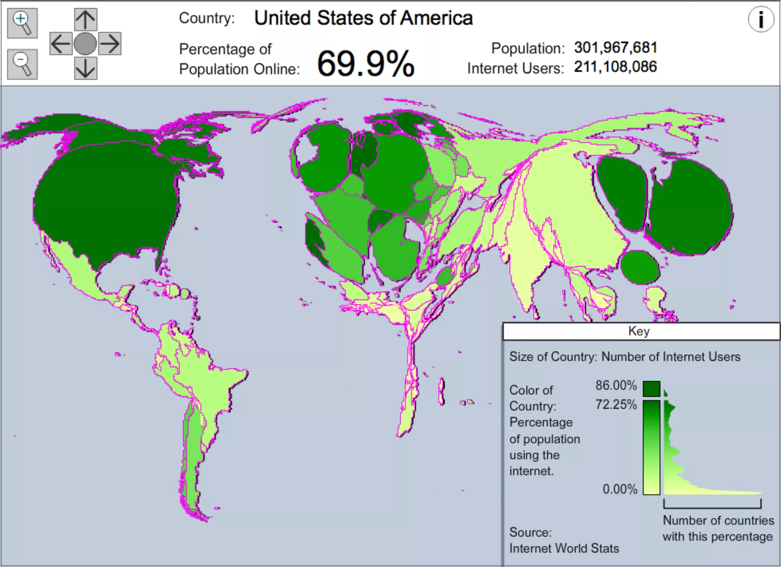 Cette carte-là représente le taux de connexion à internet des populations à travers le monde. Révélation évidente des disparités Nord-Sud.