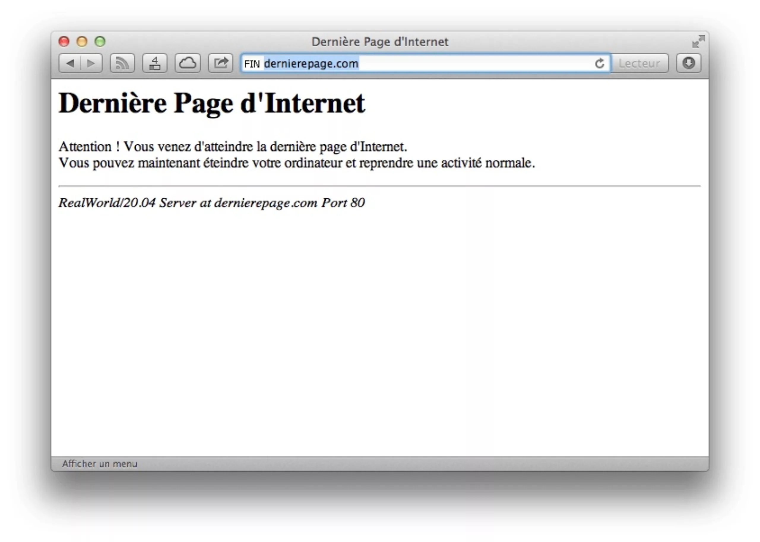 Sujet vaste, territoire peu exploré, cet article a essayé de vous offrir un panorama d’Internet. De toutes nos péridiginations, la seule chose rassurante c’est que nous avons trouvé la dernière page d’Internet, confirmant notre hypothèse : Internet a une fin !
