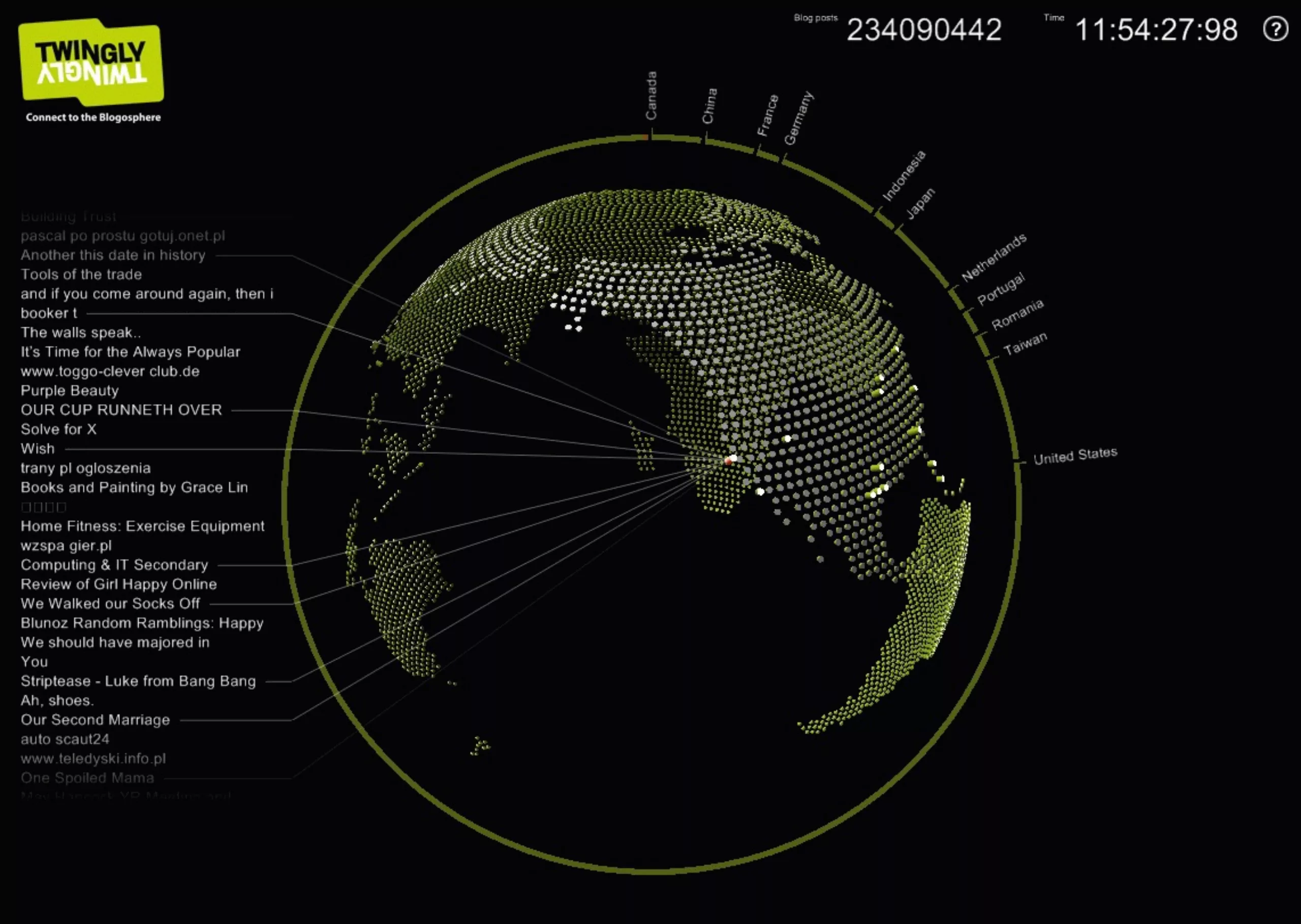 Twingly cartographie l’activité globale en temps réel de la blogosphère sur une vue tridimensionnelle du globe terrestre. Les messages postés sur les blogs sont représentés par des barres verticales au-dessus des continents.
