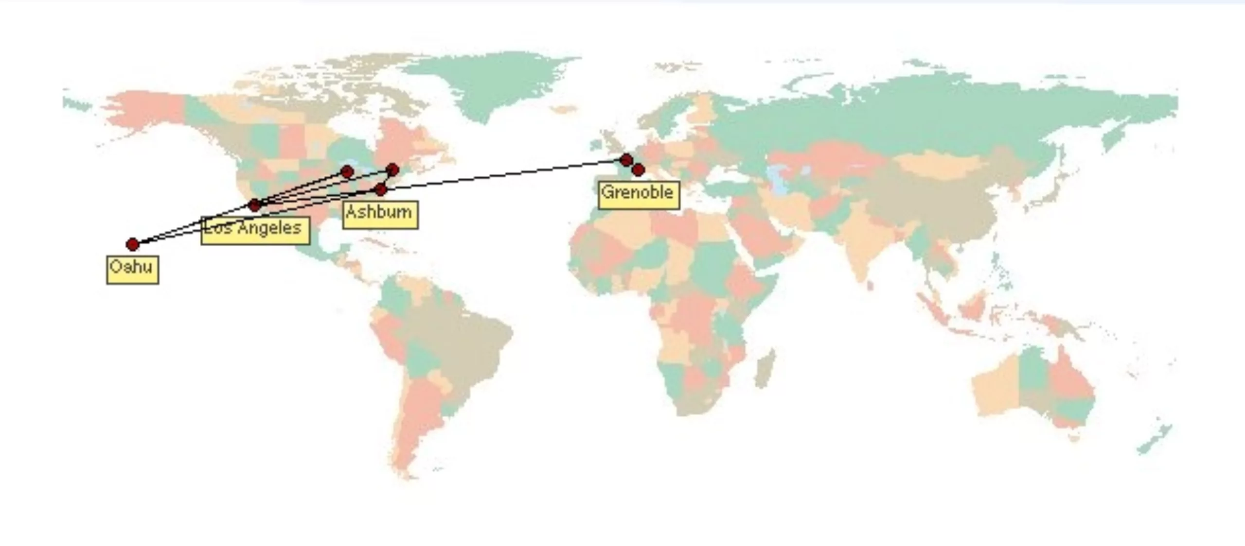 Ce site permet de visualiser la route que prend une information sur Internet. Par exemple, la route Grenoble/Hawaï passe par Paris – Los Angeles – Montréal fait quelque zigzag aux États-Unis avant de rejoindre l’océan pacifique.