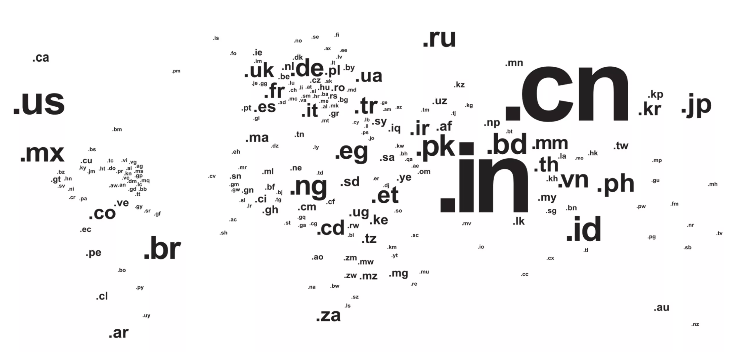 Cette carte représente de manière géographique les centaines de d’extensions disponibles sur internet. Si .fr s’associe facilement au nom de domaines français, il n’en va pas de même pour .za ( Afique du sud ) ou .lk (Sri Lanka).