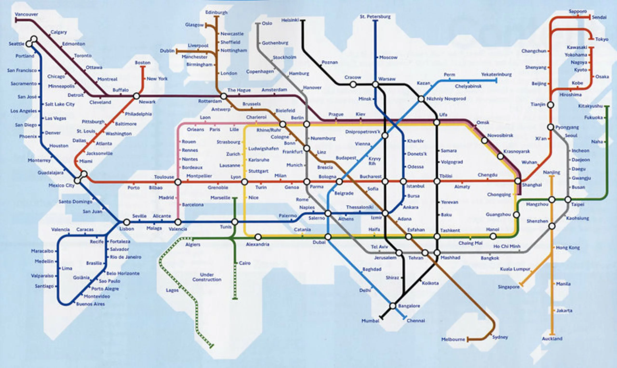 Cette carte représente les interconnexions des plus gros tuyaux d’internet sous forme d’une carte de métro mondiale. Cette carte permet de mieux comprendre les vitesses de débit dans le monde.