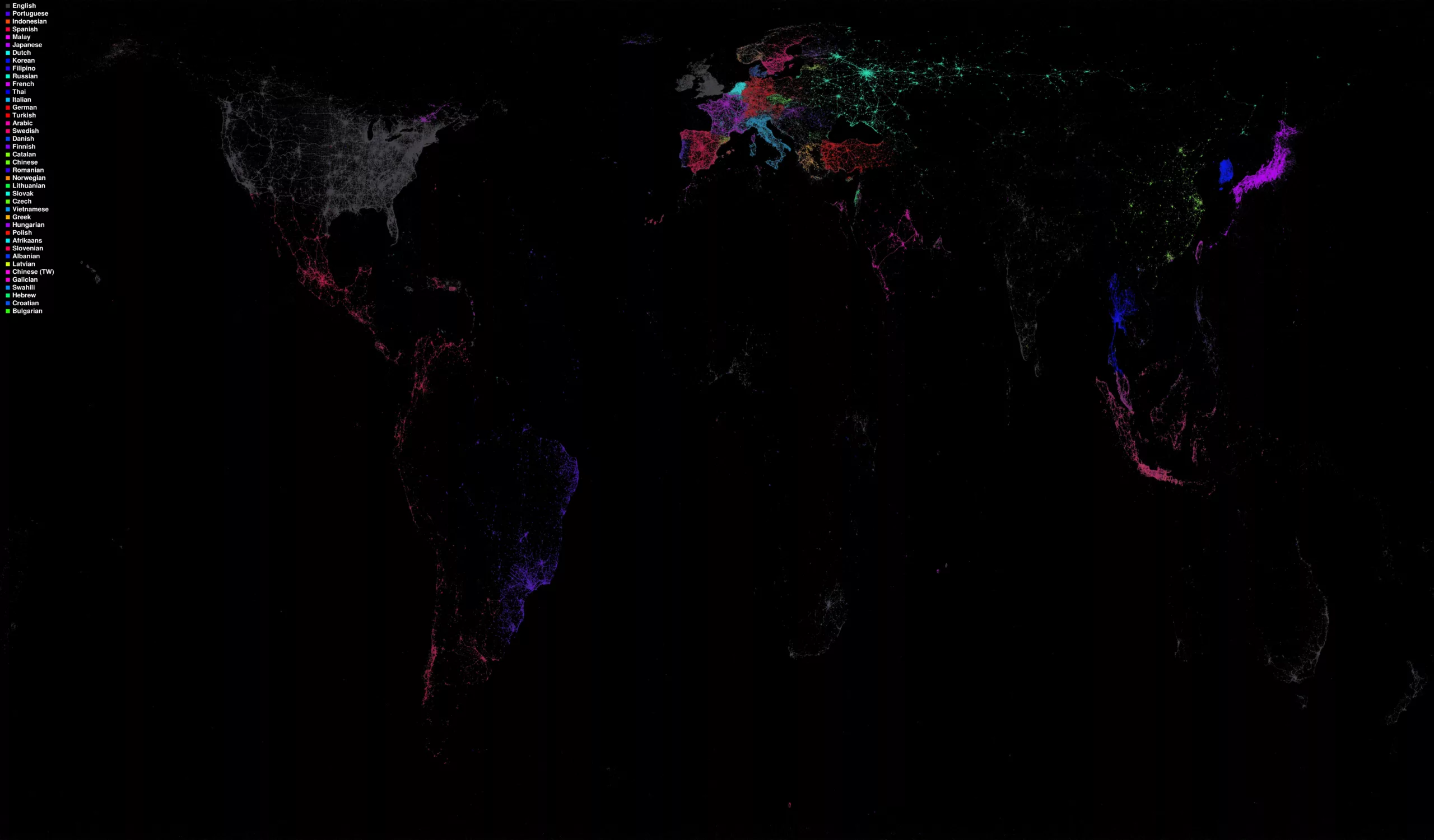 Cette carte datant de 2011, présente les échanges sur Tweeter de manière géolocalisée, la couleur changeant en fonction de la langue. Telle une vue satellite “by night”, on peut y découvrir d’étonnantes choses : c’est la nuit noire sur Cuba, les hollandais sont des tweeters fous et l’italien semble la seconde langue tweetée en France !