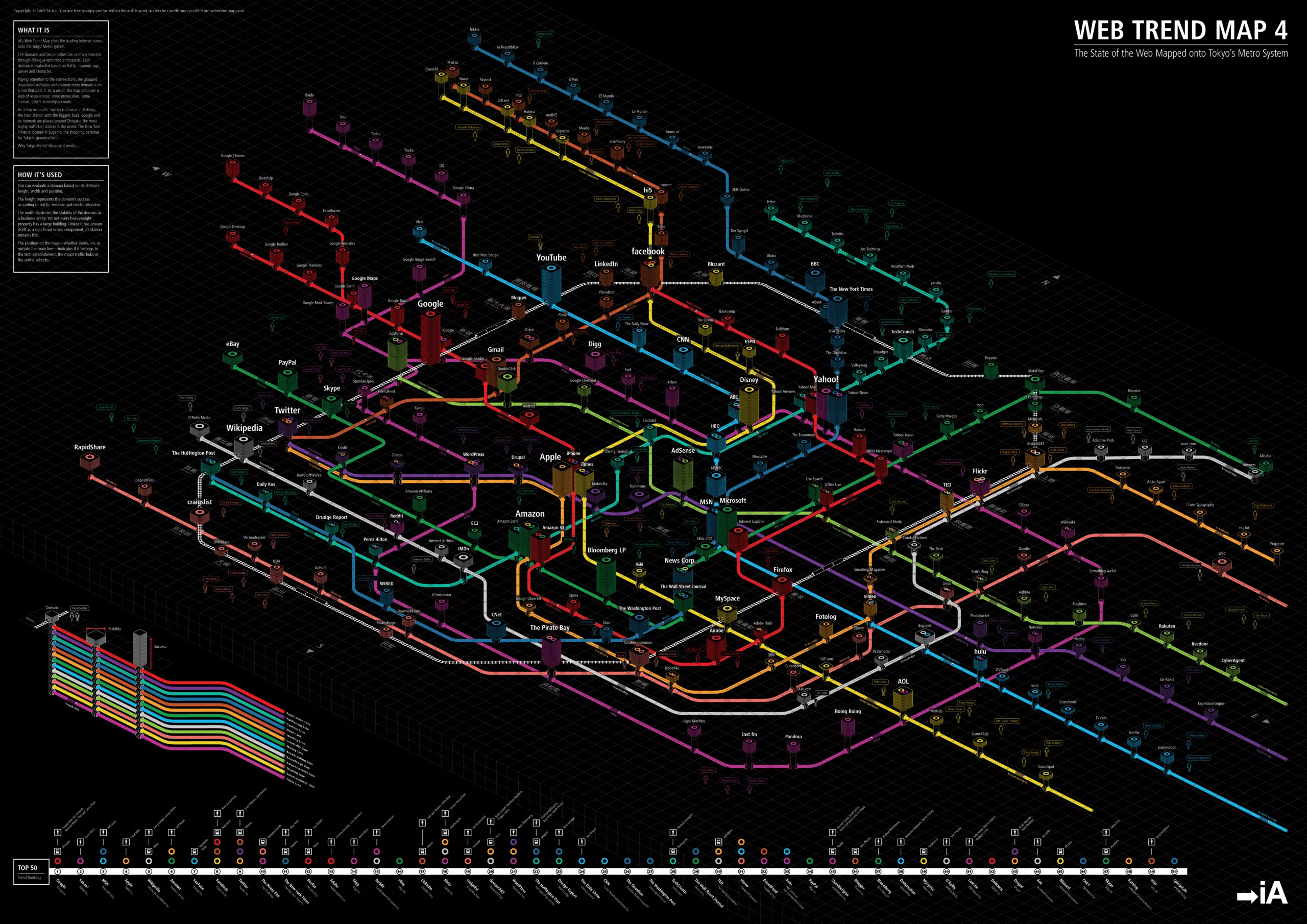 Cette carte regroupe tous les grands acteurs d’Internet (Google, Adobe, Amazon, Apple, Facebook…) qui sont organisés selon leur proximité, leur catégorie ou encore leur popularité. Ils sont disposés sur la carte de métro de Tokyo. Outre les sites classiques, Anglo-saxons pour la plupart, on trouve aussi des sites japonais, allemands et chinois.