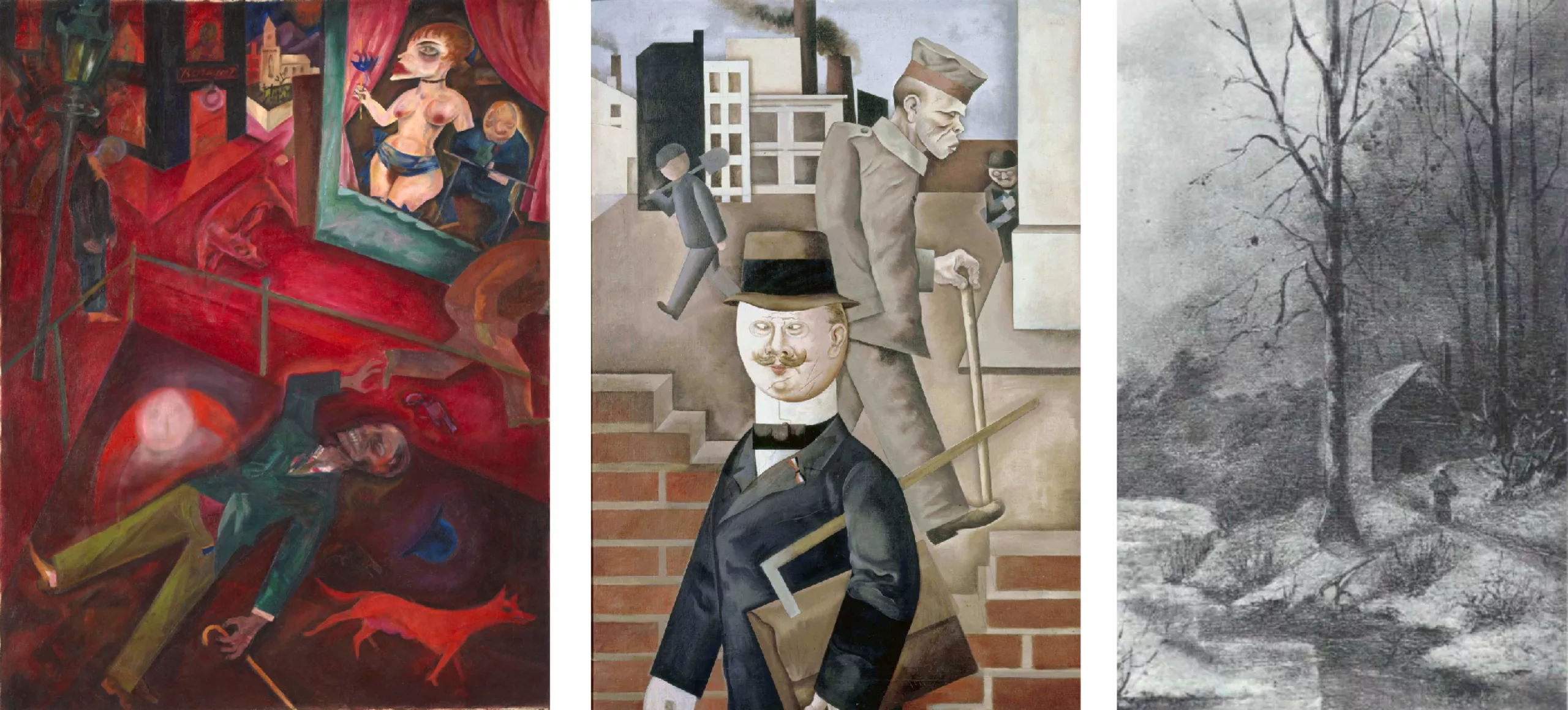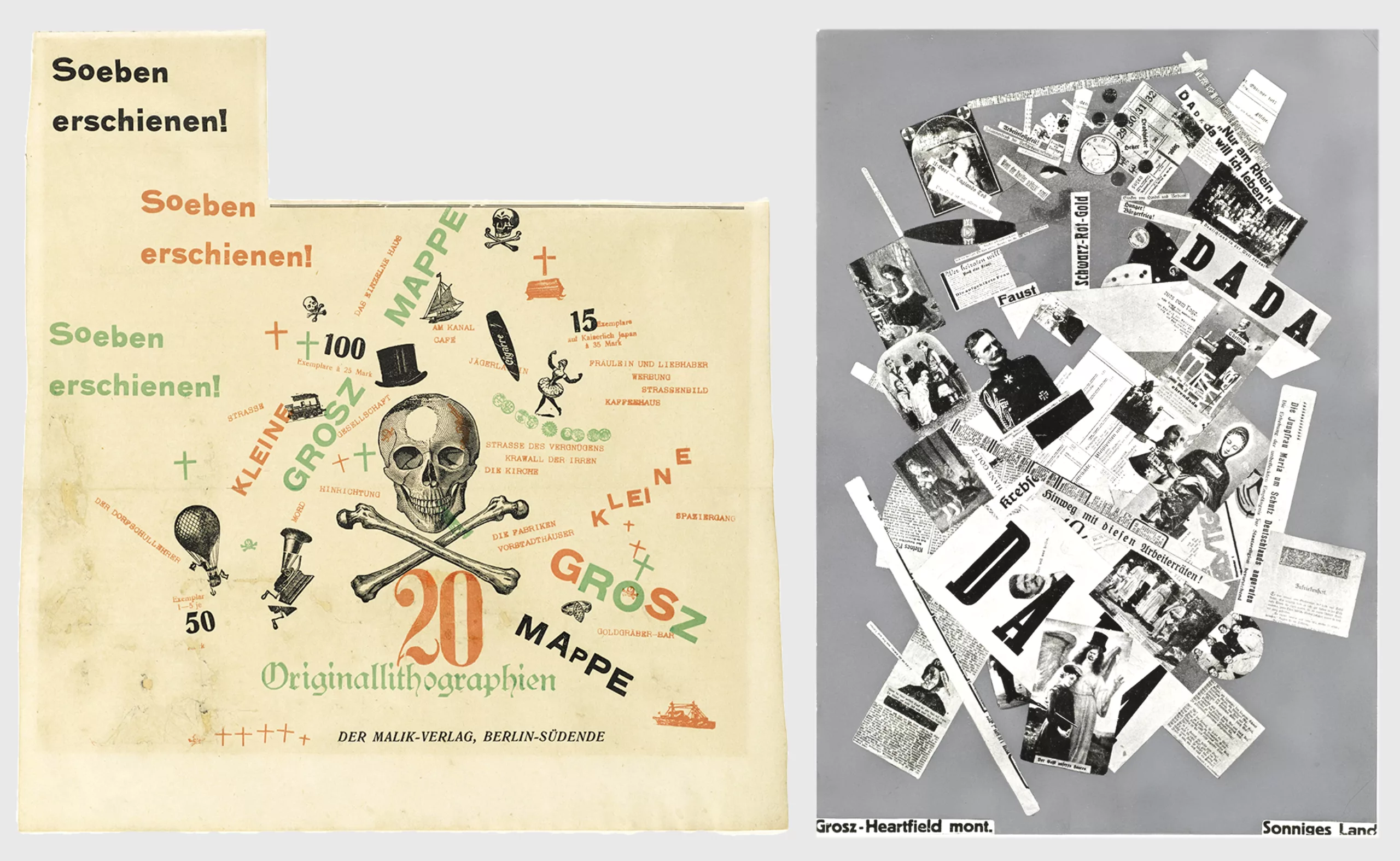 Ainé de 4 enfants, ses parents (un père écrivain socialiste et une mère activiste politique) disparaissent sans laisser de trace et dans des circonstances inexpliquées alors qu’il a 8 ans. La fratrie est élevée séparément par d’autres parents. Helmut Herzfeld passe son enfance en Suisse, puis en Autriche. Il étudie 3 ans la publicité et le design graphique à Munich, exerce un an, puis s’installe à Berlin en 1913 juste avant la Guerre, espérant devenir peintre. Une exposition futuriste le marque particulièrement : il y réalise que les artistes peuvent prendre parti à travers leur art. Les dessins de Georg Grosz, dont il deviendra proche, sont “à la fois une révélation et une douche froide” comme le formule son frère Wieland : “Nous pensions jusque là que l’art était ce qui rendait la beauté visible et audible. Grosz nous a permis d’arrêter de voir le monde ordinaire comme étant sec, terne et ennuyant, et de commencer à le voir comme un drame dans lequel la stupidité, la grossièreté et la paresse se partageaient les rôles principaux”. À la suite de cette découverte, il brûle tout ce qu’il a réalisé jusque là à l’encre, au fusain ou au crayon. Ci-dessous, à gauche, deux tableaux de George Grosz, “Suicide” en 1916 et “jour gris” en 1921, au milieu. À droite, une huile de Herzfeld de 1907.