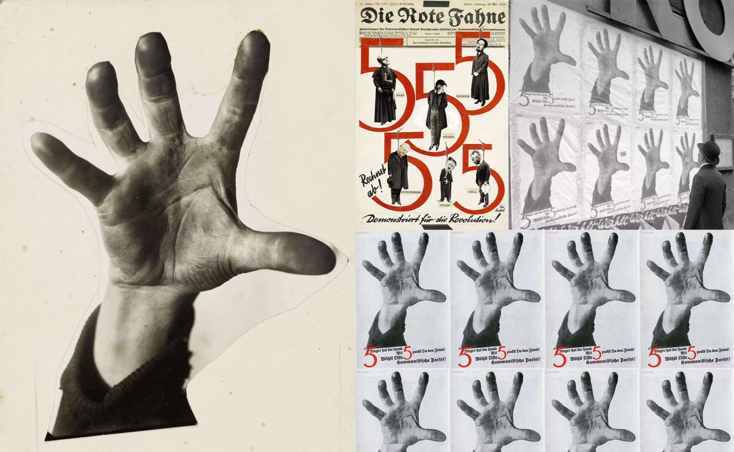 Il réalise en 1928 l’une de ses affiches politiques la plus connue, pour “la liste des 5” : “la main a 5 doigts, avec 5 vous pouvez faire échouer l’ennemi. Votez pour la liste 5”. L’idée du 5 fonctionne aussi bien pour le visuel que pour le texte et apporte une cohérence globale et un impact visuel, avec cette main de travailleur, aux doigts salis, qui se projette pour saisir (probablement des cols blancs !). On voit également les membres de la république de Weimar ou de la droite fasciste pendus à des 5 aux côtés des grandes figures religieuses avec le slogan “faites les comptes. Manifestez pour la révolution !”.