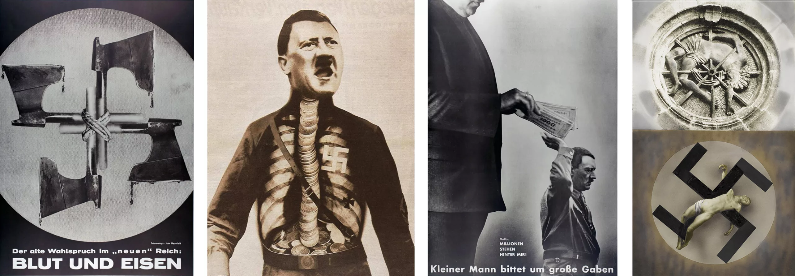 À l’entrée de la salle qui lui est consacrée dans l’exposition Film et photo de 1929, à Stuttgard, il inscrit le slogan “utiliser la photographie comme une arme” qui souligne sa foi en l’impact de ce nouveau médium et sa capacité à dénoncer les perversités du monde moderne : le fascisme, la guerre et ses atrocités, le nazisme ou le capitalisme. L’œuvre politique et satirique de John Heartfield est en effet indissociable d’un contexte historique et d’une action politique et ses collages traduisent nécessairement une opposition, une colère, une résistance face à un contexte pesant et intolérable qu’il s’engage à dévoiler.