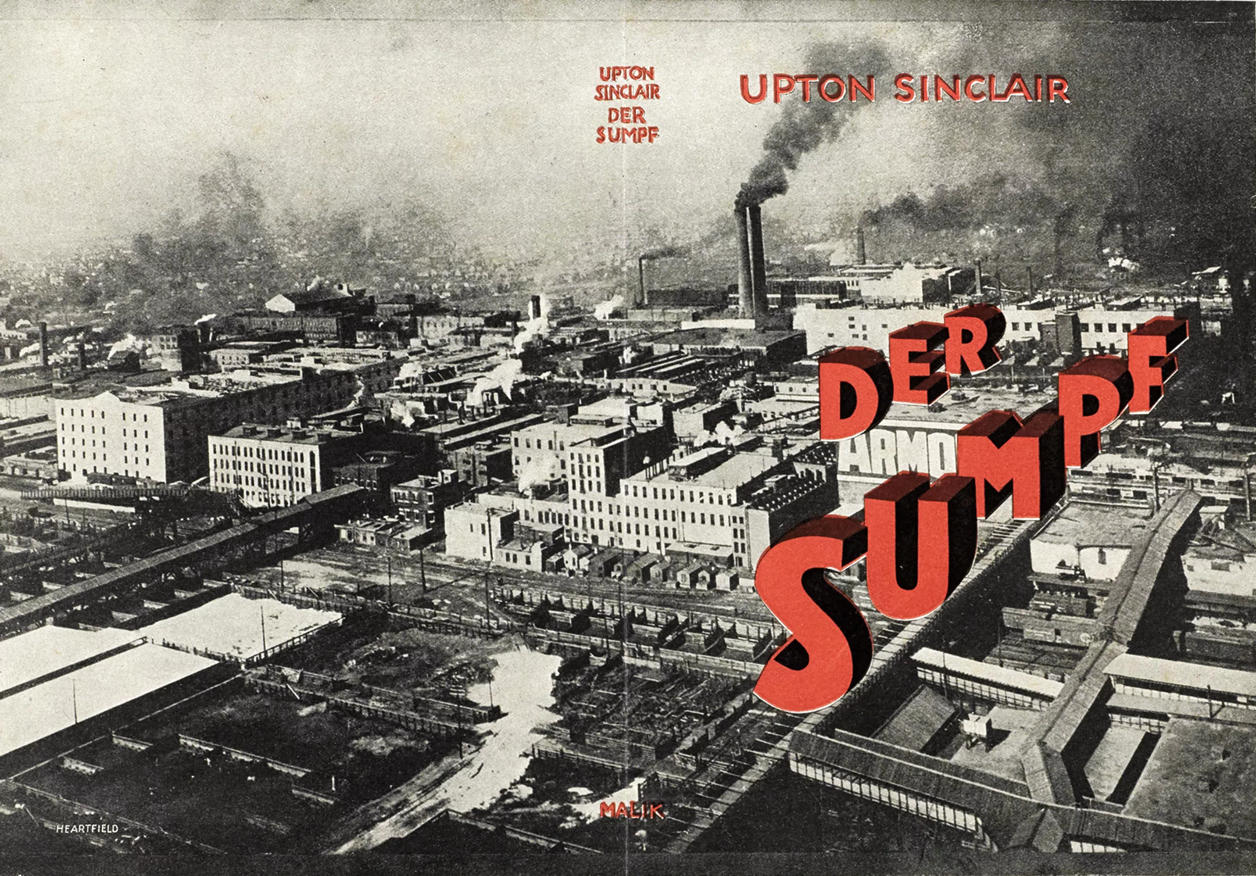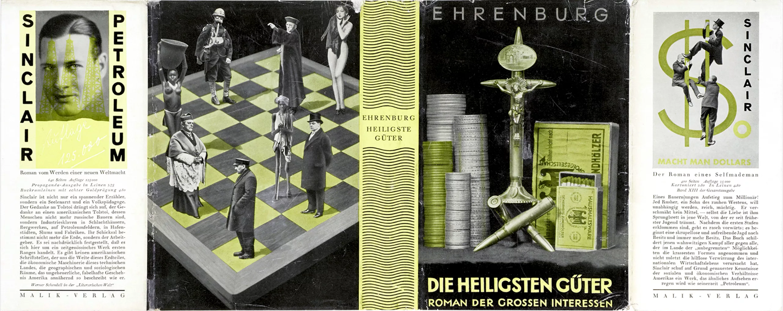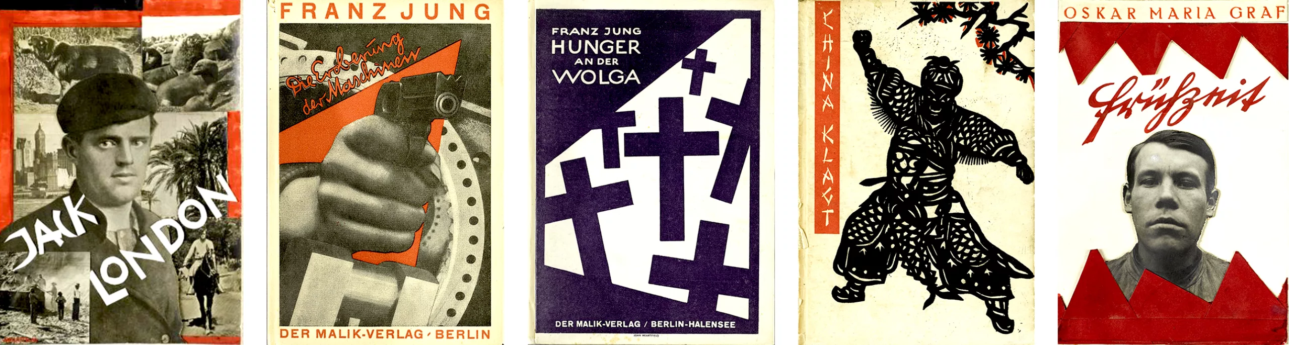En 1917, John fonde une maison d’édition avec son frère, la Malik-Verlage, pour publier des romans d’auteurs socialistes censurés, que John illustre de ses photomontages. Le fait même d’utiliser et de détourner de l’art ancien est interdit par le parti… Heartfield associe des photos sur ses couvertures de livres pour en faire comprendre le contenu d’une manière spectaculairement efficace. Il invente aussi le rabat à l’intérieur du livre, et la conception de la couverture dans sa globalité raconte une histoire au futur lecteur. La mise en page avant-gardiste de ces livres est bien plus moderne que ce qui se fait à l’époque, où l’on utilisait encore largement l’illustration, et annonce le graphisme des couvertures des années 50. En voici quelques unes :