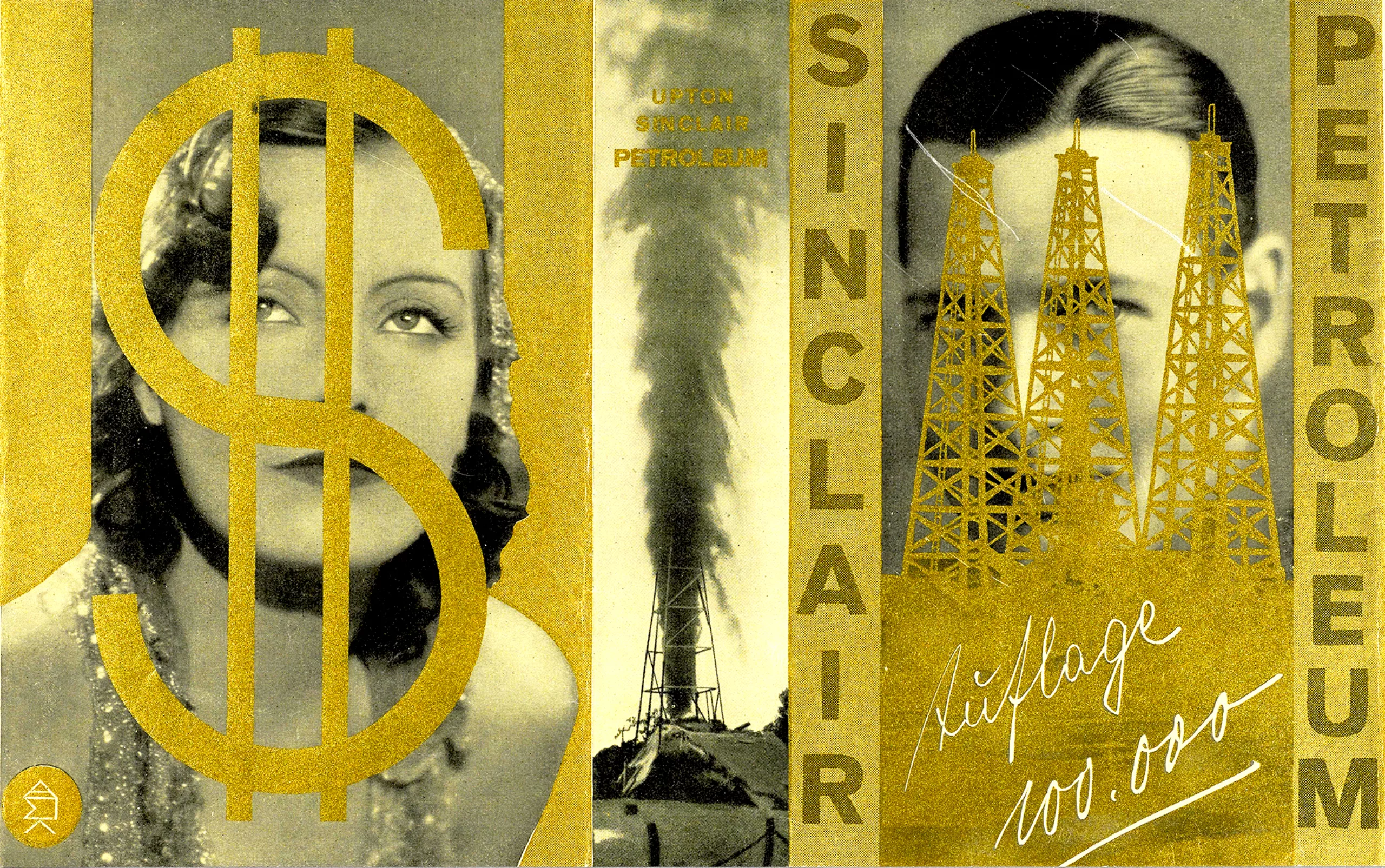Couverture du roman “les biens les plus sacrés” d’Ehrenburg, en 1931. Elle représente par association les objets sacralisés sur la couverture – l’argent, la religion, le pouvoir – et les relations stratégiques que jouent les grands de ce monde, au dos du livre. Heartfield a construit un crucifix avec des balles avant de le mettre en scène et de le prendre en photo (vous pouvez voir les images en grand en cliquant dessus). Pour la photo des 3 hommes grimpant sur le $, il fait poser des amis sur un échafaudage qu’il prend en photo, développe puis découpe les silhouettes avant de les associer à un dessin de dollar.